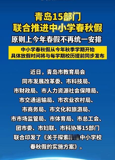 原则上不再安排春秋假!青岛最后压轴表态。至此,山东省16个城市的春秋假安排均都做出了明确,除青岛不作安排之外,省会济南和潍坊也表示不安排春假,而其它13个地市,均已做出了明确具体的安排,有些城市直接安排到五一,连接起来共休8天。 这份假期表一出来,家长群里直接炸了锅。大家的心情很矛盾:一边羡慕孩子能连休8天,一边又为自己还得上班、孩子没人管而发愁。 这对孩子来说绝对是福音,意味着能彻底从书本里钻出来,享受一个不算短的假期。但凡事都有两面性,这种硬凑出来的长假,对学校的教学进度是个不小的考验。 所以,我们也看到了像青岛和潍坊这样的“冷静派”。特别是青岛,作为最后一个表态的城市,明确今年春季不仓促安排,而是等到秋季学期再正式启动。 这种做法也是出于务实的考虑,毕竟学期过半突然插进个假期,课怎么补、进度怎么赶,都需要时间准备。 说到底,政策设计的初衷是好的,目的就是想给孩子“留白”,鼓励孩子们“读万卷书,行万里路”,走出教室,走进自然、景区和博物馆。 可理想很丰满,现实却很骨感。放假的难点从来不在学校,而在学校之外。虽然文件里写着“鼓励用人单位落实带薪休假”,但在普通人的职场里,想为了陪孩子放假就请假,不仅要扣钱,还得看老板脸色。 结果就是,原本想促进亲子关系,最后可能变成了老人的“受累假”,或者是孩子在家抱着手机过个“电子假期”。 这也是为什么经济更发达的城市反而更谨慎。青岛、济南的双职工家庭比例高,家长工作节奏紧,一旦孩子放假没人管,矛盾反而比小城市更大。 而那些敢放8天长假的地方,未必没有这个难题,只是它们选择了一种更积极的姿态:先放再说,配套慢慢跟上。 回头看这轮春秋假的博弈,一个道理其实很清楚:放假容易,放“好”不容易。 给三天假期就是一纸文件的事,但要让孩子真正从题海里抬起头来,去田野里跑一跑、去博物馆看一看,需要的不只是公文,更是企业休假制度的完善、应试制度的改变、以及整个社会对“成长”二字的重新理解。 对此你有什么看法?欢迎在评论区留言讨论。领航新锐收益节节高 信息来源: 山东教育新闻网|山东13市公布中小学春秋假时间 文|战战 编辑|史叔