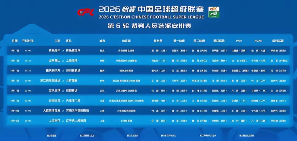 中超联赛第6轮的裁判安排很有意思,知名裁判马宁、李海新、沈寅豪、张雷、麦麦提江、杜建鑫等都没出现在主裁判名单中,马宁和沈寅豪甚至没有出现在裁判名单中,李海新、麦麦提江、杜建鑫等担任了VAR裁判。 山东泰山队主场对阵上海海港的焦点比赛主裁判是来自广东的梁松尚,这么重要的比赛足协安排不出名的梁松尚执法比赛,说明足协还是认可梁松尚的执法水平的,大家了解梁松尚裁判吗? 唐顺齐因为错漏判已经降级到中甲执裁了,那么马宁和沈寅豪又去哪里了呢?