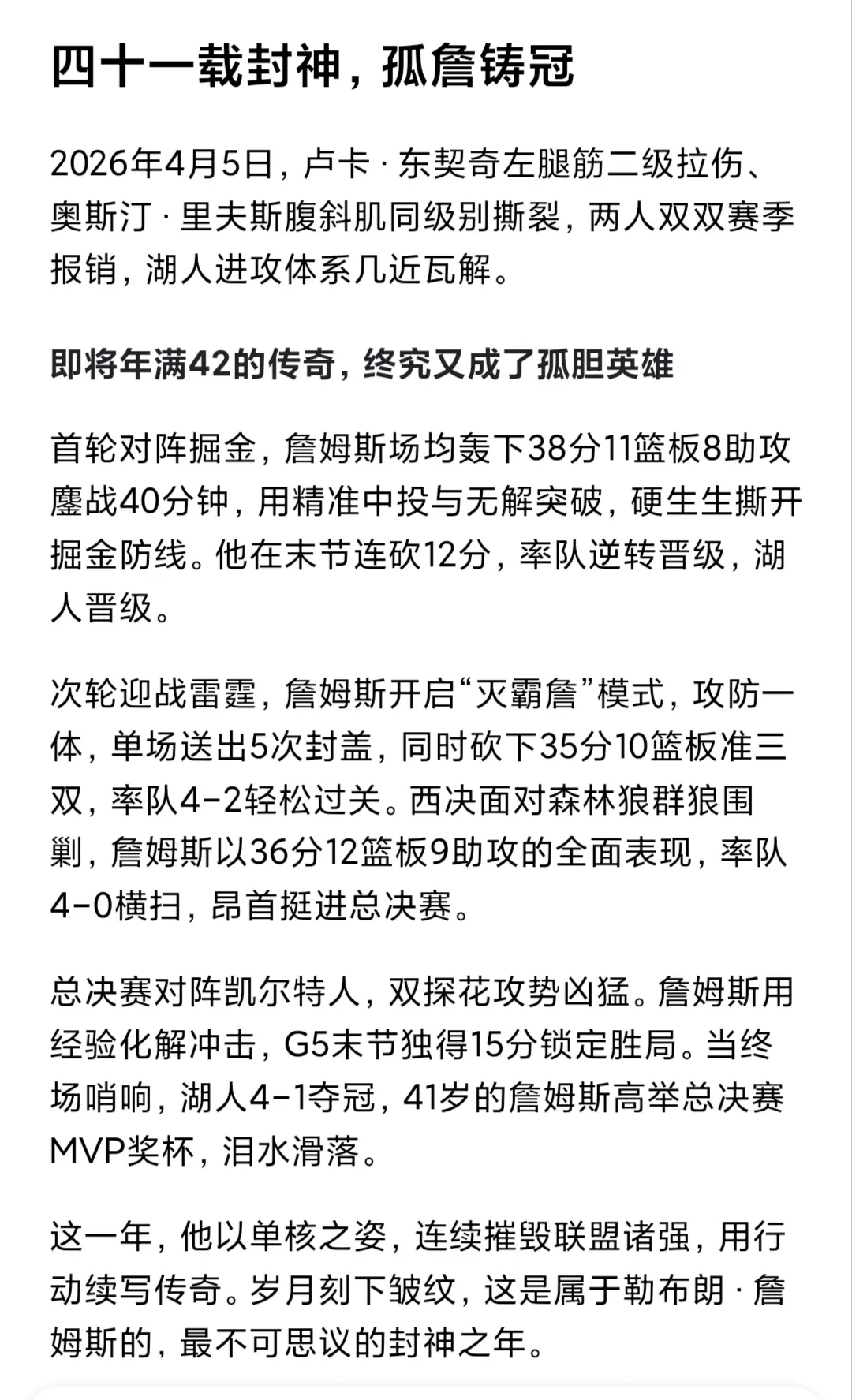 雷迪克:我们需要詹姆斯得分、组织、防守、抢板...詹姆斯:我41了,不是31. 【38评论】【8点赞】 勒布朗·詹姆斯 j.j.雷迪克 东契奇 森林狼 国际当红篮球明星 西北望体育 2026-04-11