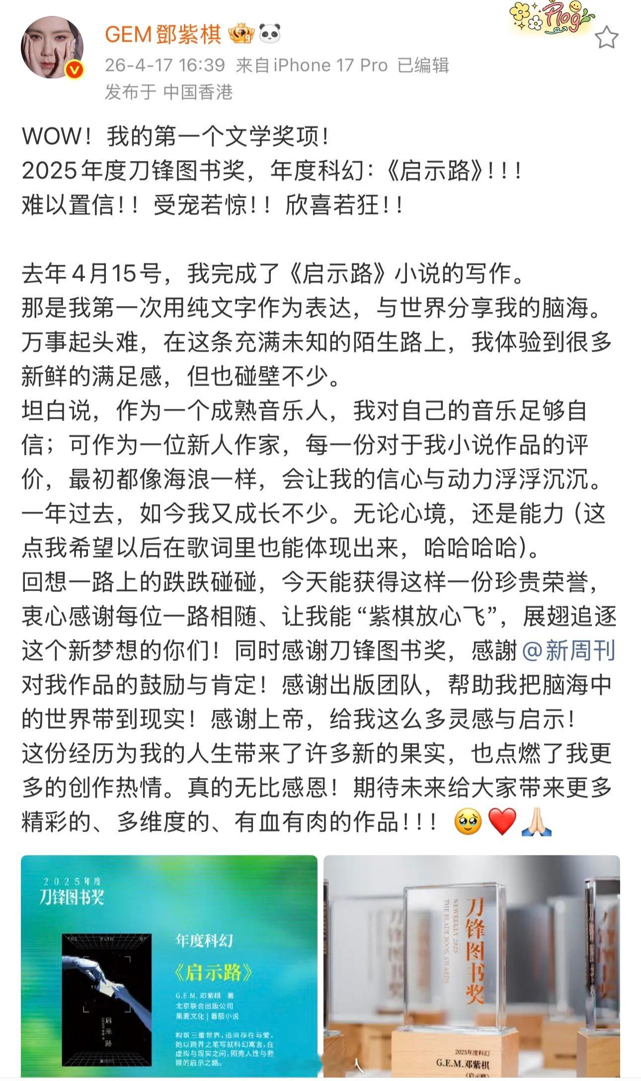邓紫棋的第一个文学奖项邓紫棋小说获奖 邓紫棋的第一个文学奖项🏆2025年度刀锋图书奖,年度科幻:《启示路》!!!恭喜姐姐!