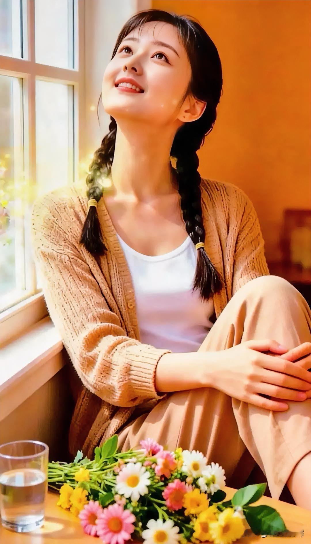 暖阳漫过窗棂,碎金落满肩头。 麻花辫轻垂,系住童真温柔。 针织开衫裹住软风,内搭白衫映着纯真。 她仰脸,笑意洇开如糖霜。 花束在旁,与水杯共守静谧。 美在寻常里,是时光也愿停驻的晴朗。
