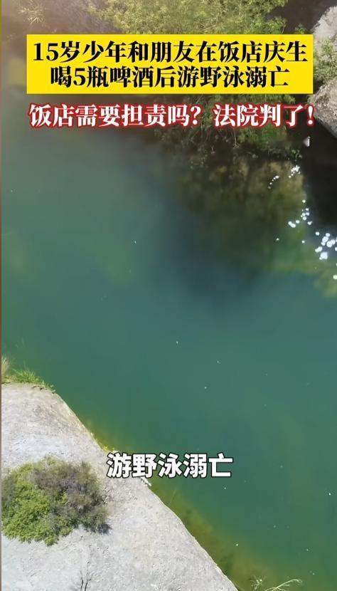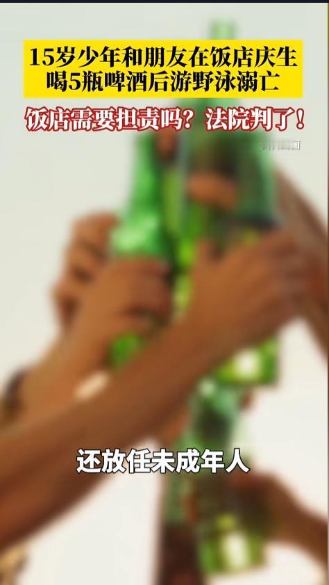 “又是喝酒惹的祸!”去年9月,辽宁,一15岁少年,在饭店给朋友庆祝生日,席间喝了5瓶啤酒。饭店知道他们未成年,也没有阻止。酒足饭饱之后,少年非得要去游野泳,结果不幸溺亡。家长将饭店告上了法庭,索赔5万,法院判了! 喝酒出的事儿可真不少,酒驾的,吃错药的,跳楼的,耍流氓的,案例太多太多了,可这些大都是成年人了。今天这个案例,却是个未成年人。 据媒体报道,当时,这几个人在饭店里庆生,还要了啤酒。席间,少年自己一个人喝了5瓶,人也变得兴奋了。饭店老板也知道这几个都没成年,但是也没放在心上,更没有出面制止。 离开店后,他们还去了鱼塘。也许是酒后太过兴奋,做事连后果都不管了,他们下水游了个野泳。结果游泳时,少年不慎溺亡。 事后,家长就把饭店告了,认为饭店向未成年人卖酒,是导致自己孩子死亡的原因之一,要求索赔5万元。法院审理后,同样认为饭店没有尽到审查义务,最后判了担责50%,赔偿2万多。 网友看后表示,饭店不冤,明知道是未成年人,还卖酒给他们,这已经触犯法律了,何况还出了人命! 信息来源:《15岁的少年在饭店给朋友庆生,喝5瓶啤酒后游“野泳”溺亡,家长起诉饭店索赔5万余元。法院认为,饭店经营者放任未成年人在饭店内饮酒,是导致其溺亡的间接原因,酌情其承担5%的赔偿责任,共计人民币2万余元。》第1眼新闻