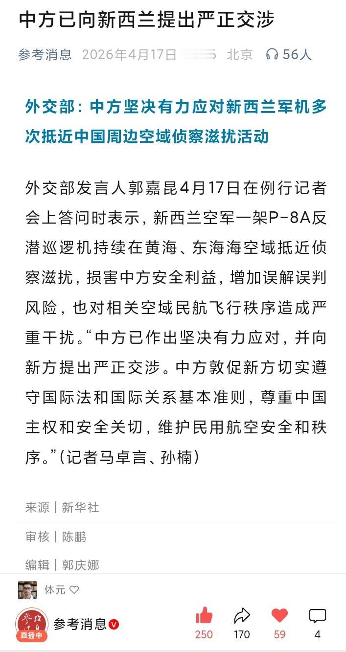 相距万里之遥的新西兰,凭什么闯到中国家门口搞事? 看到新西兰军机冒然闯入我国黄海东海海域抵近侦查的新闻,笔者不禁回想起20多年前在新西兰留学的往事。 记得当时有一回跟随寄宿家庭男主人开车出去兜风,经过一处山坳时,男主人向我介绍道,这是新西兰的某处空军基地,还打趣说“哪天万一新西兰和中国起军事冲突,你怎么看?”,我当时不假思索地回答: 这不可能。男主人闻言哈哈大笑…… 当时的我才20出头,以当时的认知水平来看,只觉得男主人的这个问题挺荒唐的。毕竟万里相隔的两个国家,没领土争端,没利益纠葛,新西兰守着自己的南太平洋的一亩三分地,怎么可能和中国有军事摩擦? 时至今日,当年觉得“不可能”的事,真成了现实。新西兰空军的P-8A反潜巡逻机,居然万里迢迢地闯到黄海、东海,持续性地进行抵近侦察,目前正在被我方严正交涉。 很多人不解:如果是小本子凑这个热闹,好歹是隔海相望的邻国,有地缘矛盾能理解。可新西兰偏居南半球一隅,远离世界任何一个大国,向来以“和平中立”自居,为什么非要蹚这趟浑水? 其实根本不是“地缘矛盾”,而是新西兰被绑上了别人的战车。 要知道新西兰属于五眼联盟、澳新美同盟的成员,美国的军事背书,就是它的安全底气。全国不到1.5万现役军人,国防力量薄弱到离开美国的支持,连南太平洋的话语权都保不住。 派P-8A来中国周边,本质就是给美国交“投名状”——证明自己听话,能配合印太战略的对华围堵。 说起这架P-8A,可不是普通侦察机。它是波音拿737改装的“空中反潜工作站”,速度比老式反潜机快近30%,能在2000公里外海域停留,布下声呐网精准捕捉潜艇信号,还能挂载鱼雷直接攻击。 更关键的是,它带着先进雷达和电子侦察设备,相当于一个“空中间谍”——既能盯着我们的水面舰艇动向,又能偷偷收集雷达、通信信号,把我们周边的军事、电磁情报全摸走。 新西兰把这么危险的家伙,开到中国家门口,图的根本不是自己的利益,而是美国盟友的“认可”。可它忘了,自己的经济命脉,早和中国绑在一起。 中国是新西兰最大贸易伙伴,乳制品、牛羊肉出口全靠中国市场。今天为了讨好美国搞侦察,明天中国市场一旦出现波动,它拿什么填补经济缺口?美国能给它牛奶、牛肉吗? 更讽刺的是,它一边享受着对华贸易的红利,一边用美国卖的装备,帮美国监视中国。这不是糊涂,是什么? 当年我觉得“相隔万里不可能有冲突”,是相信国家利益会主导外交选择。可现在才懂,在大国博弈的高压下,小国的利益根本不算数。 美国把“对华对抗”当成政治正确,不管你远在南半球还是北半球,只要是盟友,就必须站队。新西兰没有拒绝的底气,只能硬着头皮上,亲手打破自己“和平国家”的标签。 对此咱们的态度从来很明确:主权红线不容碰,不管你是大国还是小国,不管你隔多远,敢来家门口搞侦察,就要付出代价。 严正交涉是第一步,后续的跟踪监视、专业驱离,是更直接的反制。新西兰以为能靠这种投机换安全,实则只会两头吃亏——既换不来美国真正的庇护,又会失去中国市场的红利,毁掉中新建交以来的务实合作氛围。 说到底,新西兰该醒醒了。万里之外的热闹,不是谁都能凑的。跟着别人的节奏当“马前卒”,最终只会把自己的未来,搭进大国博弈的赌局里。