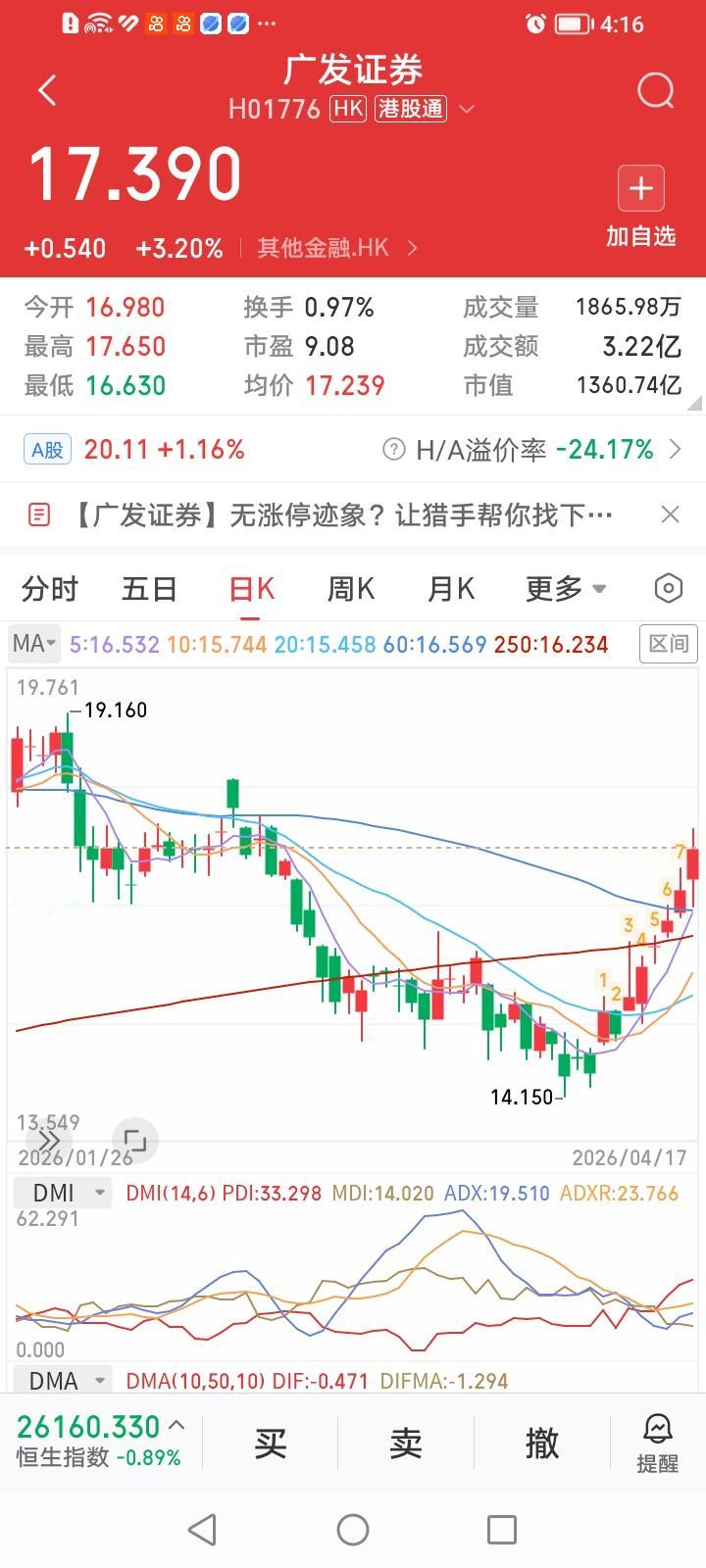 强者恒强,广发证券收出六连阳!广发证券A,今天收盘上涨1.16%,涨幅居券商股涨幅排行榜第一名。并连续三个交易日站稳年线。 广发证券H今天收盘更是大涨3.2%,股价早已强势收复年线并向上拓展空间。 广发证券H这波六连阳比广发证券A走的强不少,广发证券A股价还在年线附近纠缠不休,而广发证券H股价已经一骑绝尘,股价高于年线8%了。 广发证券H走势这么强的原因是什么?是因为稳定币概念吗?