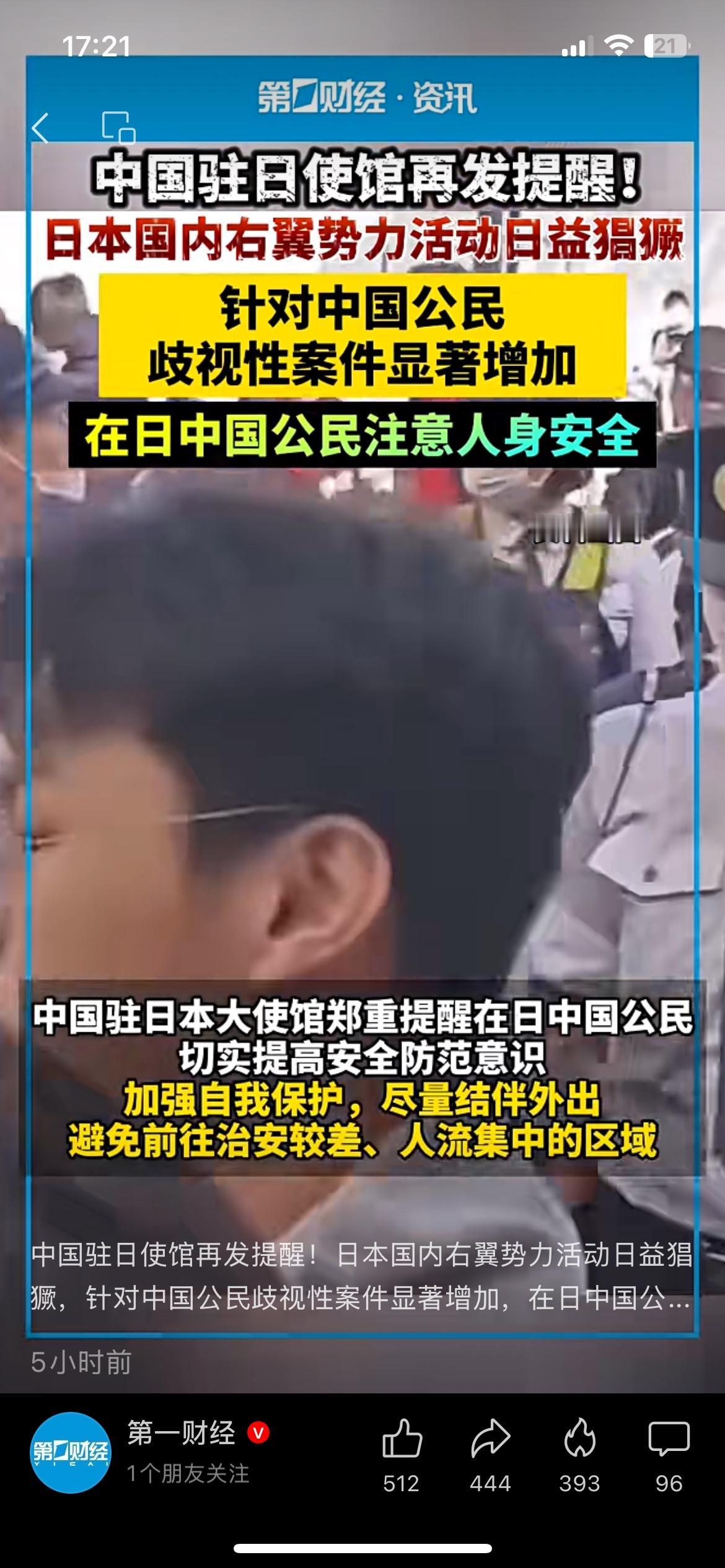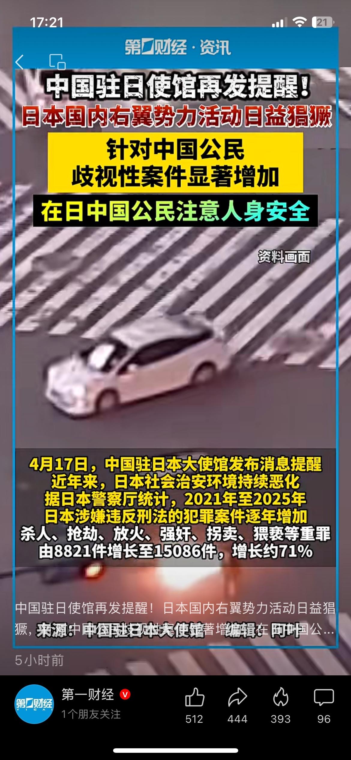 驻日使馆连发提醒!日本治安恶化,针对华人歧视案暴增 驻日使馆近期多次发布安全提醒,日本国内右翼活动明显增多,针对华人的歧视与骚扰事件也在上升。官方数据显示,2021到2025年日本重罪案件涨幅达到71%,恶性犯罪比以前多了不少。近期打算去日本的朋友一定要多留心,晚上尽量别单独外出,少去偏僻地段,安全永远放在第一位。 日本治安 驻日使馆提醒 华人安全 出国旅游东京中国人遭袭
