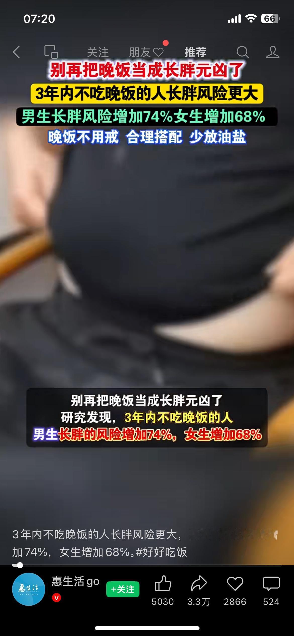 别再戒晚饭了!研究显示:3年不吃晚饭的人,长胖风险反而更高 好多人减肥都靠不吃晚饭,以为这是捷径,其实大错特错。新研究出来了,坚持3年不吃晚饭的人,长胖风险反而比正常吃晚饭的人高出一大截,男生涨74%,女生涨68%。为啥?因为节食会让你食欲暴涨,其他时间吃的更多,代谢还会变差。说白了,减肥不是挨饿,晚饭得吃,只要少油少盐,控制好分量就行。 减肥常识 健康饮食 不吃晚饭