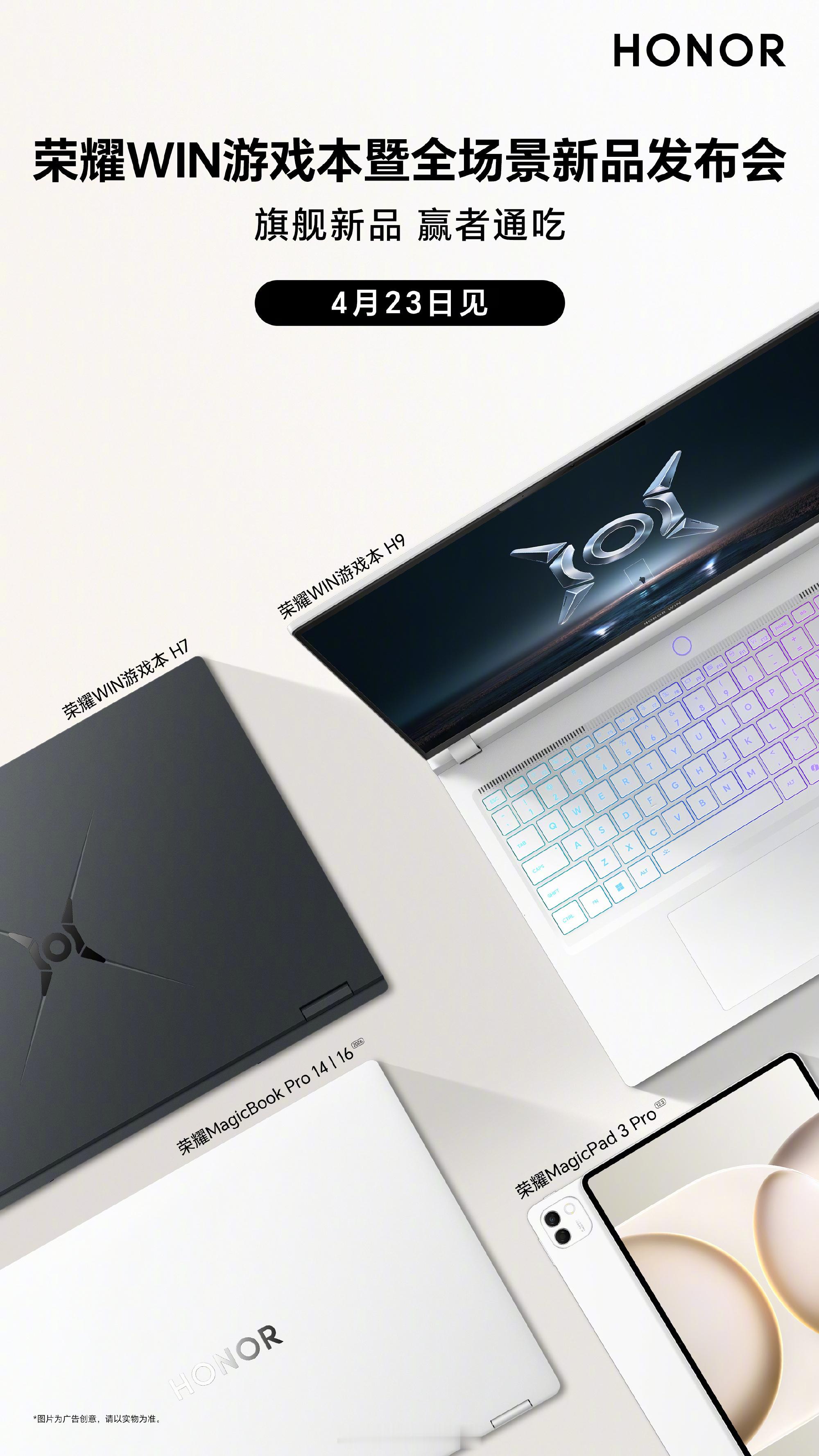 荣耀 WIN 游戏本暨全场景新品发布会定档 4 月 23 日,除了三款笔记本新品,还有一台 MagicPad 3 Pro 12.3 英寸平板。荣耀小平板还得等一段时间。