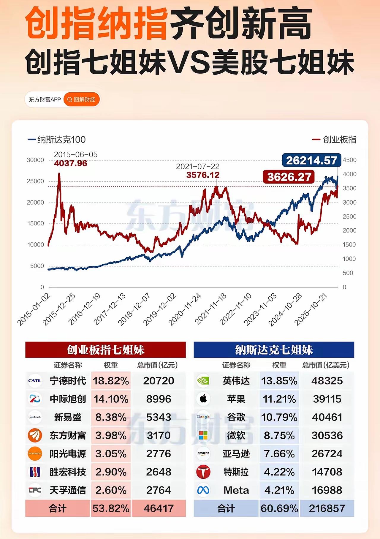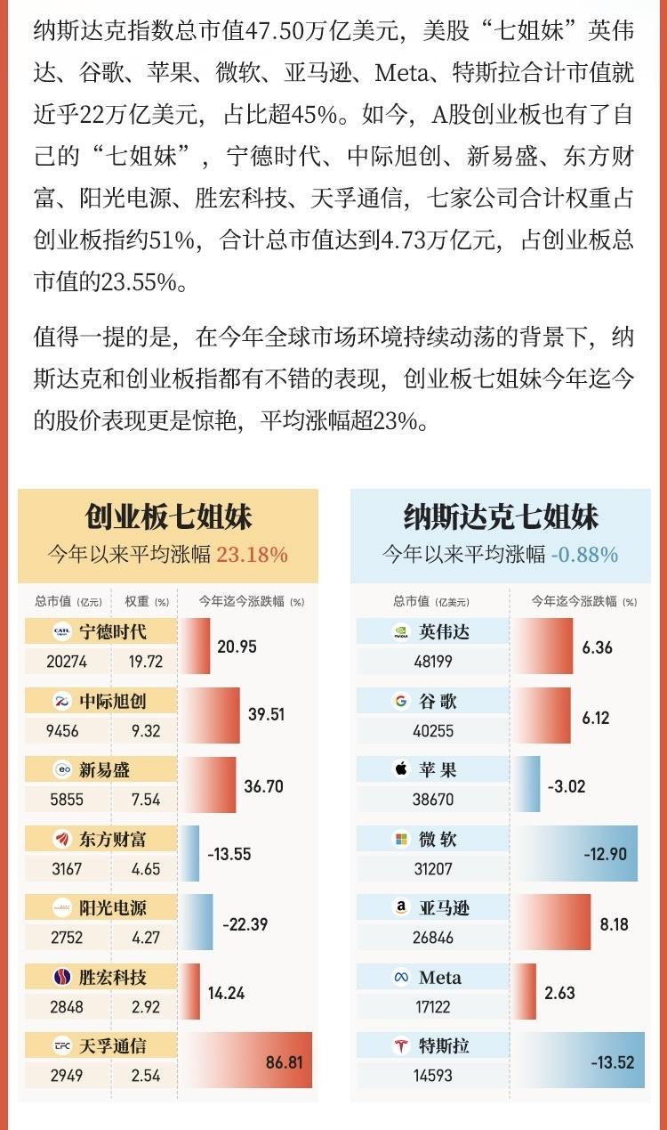 创业板七姐妹vs纳斯达克七姐妹。 “七姐妹”占创业板100和纳指100比重: 53.82%vs60.69%。 “七姐妹”占创业板和纳斯达克的比重:23.55%vs45%。 美股有“七姐妹”,A股也要有“七姐妹”,美股不断创历史新高是全球价值投资的典范,七姐妹代表全球科技公司的最高境界,A股怎么不学习一下呢? 所以所谓创业板“七姐妹”完全就是东施效颦,自我狂欢,终究会成为昙花一现的笑话。