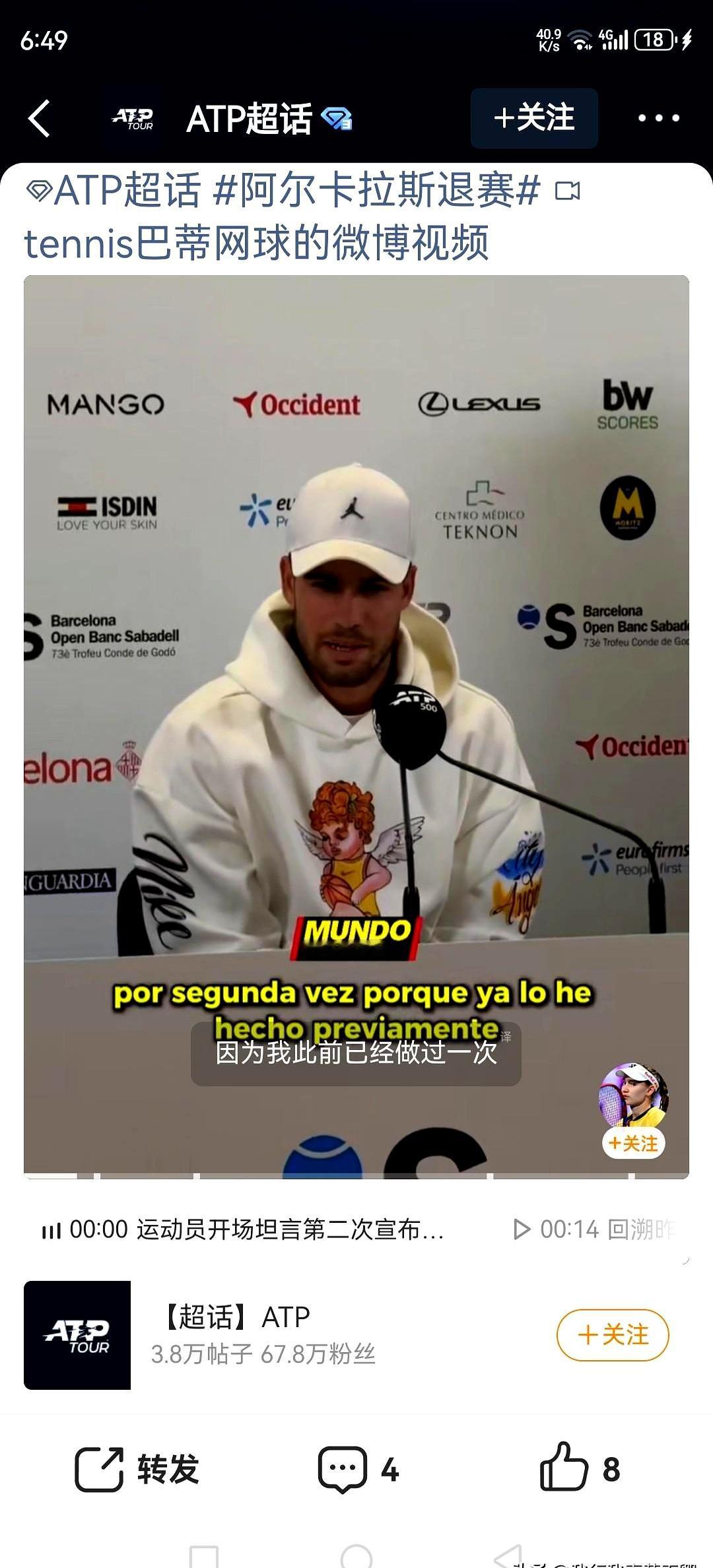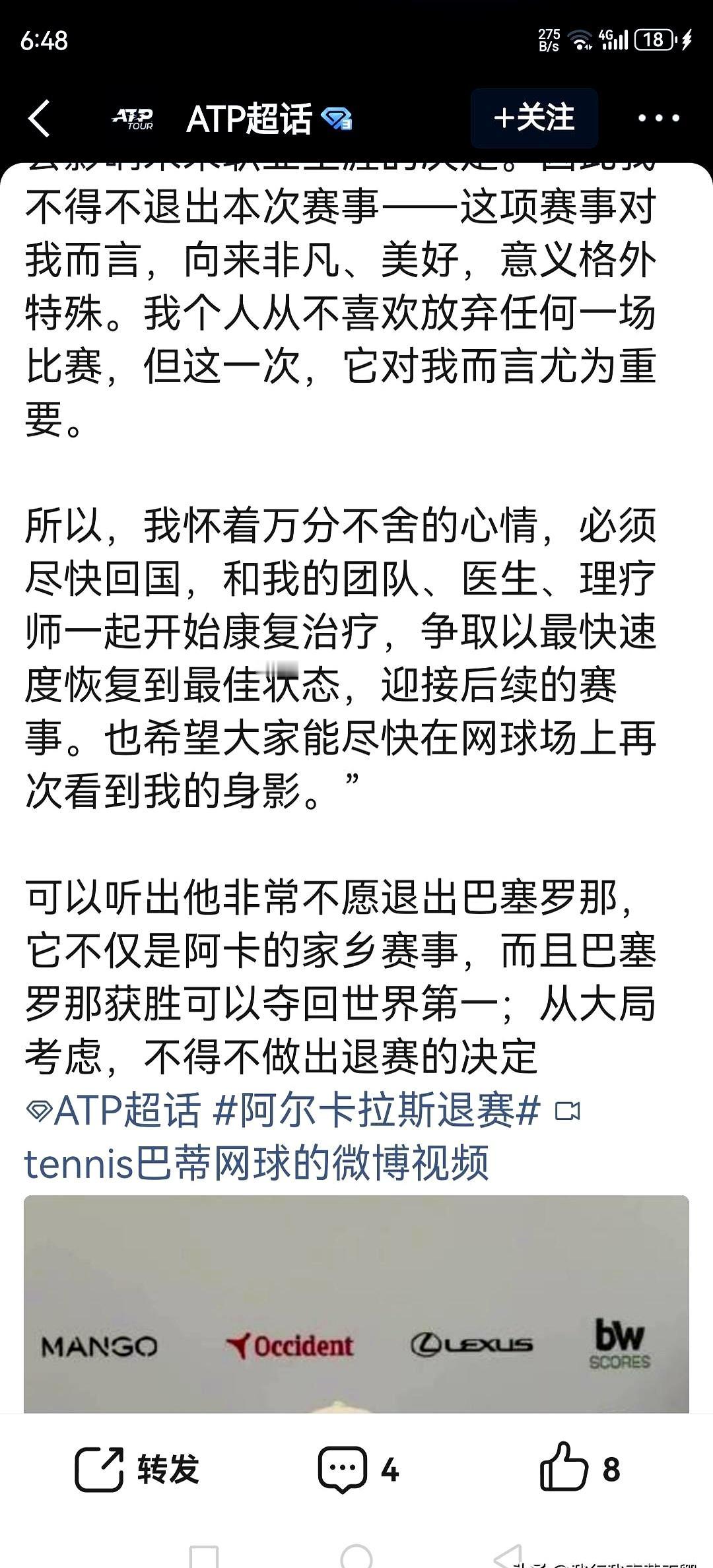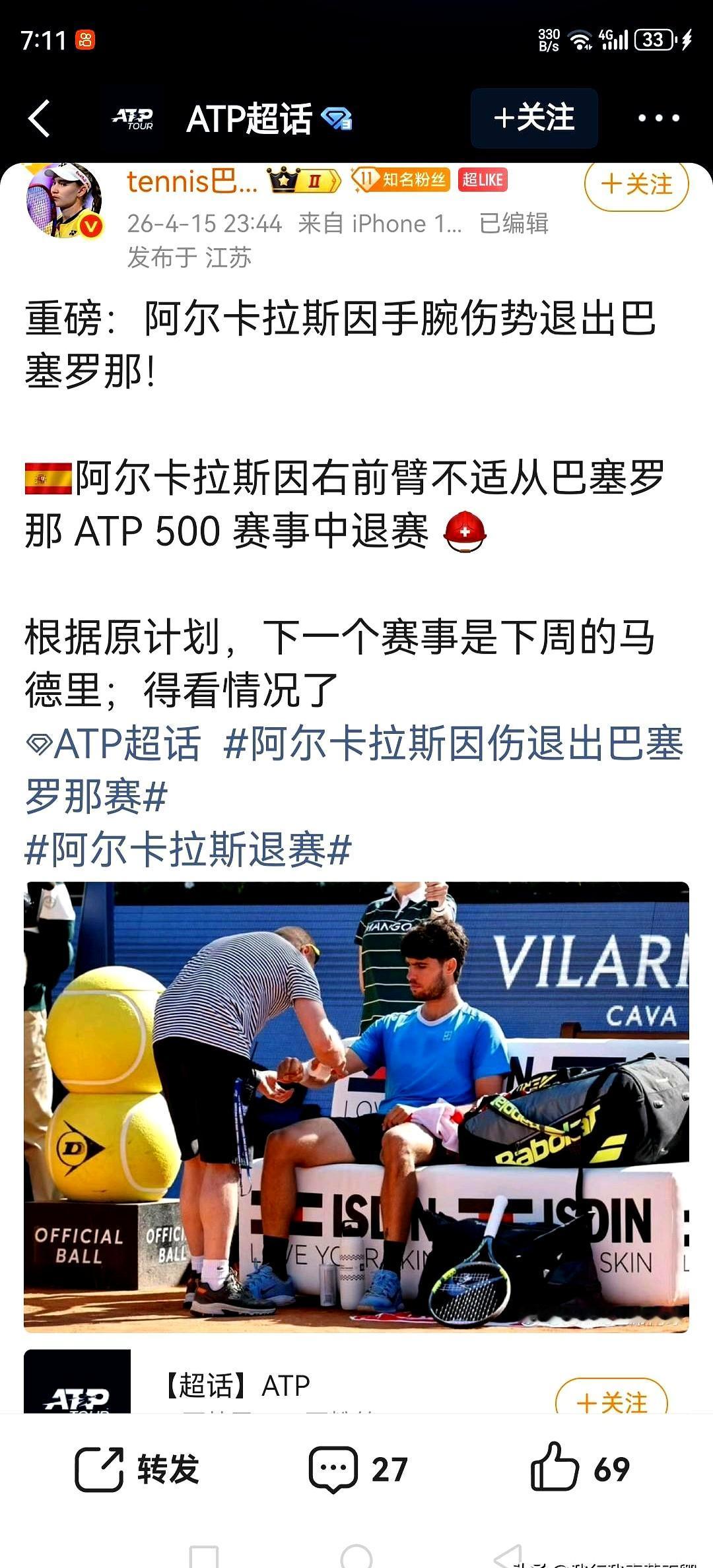 阿尔卡拉斯还是退赛了!这位世界第二刚在巴塞罗那赢了首轮,右手腕就出了大问题。 当时他回球后觉得手腕使不上劲,本以为是累的,结果检查发现右前臂肌肉损伤挺严重。为了不毁掉职业生涯,他决定听身体的话,不硬抗了。 这下他不仅没法卫冕,连重返世界第一的机会也丢了。扬尼克·辛纳将继续稳坐榜首,两人的积分差距正在拉大。 他现在已经回国治疗。接下来的马德里大师赛能不能赶上还是未知数,眼看法国网球公开赛也要到了。 顶级运动员在巅峰期敢停下来止损,确实需要勇气。你们觉得他这次选择明智吗?