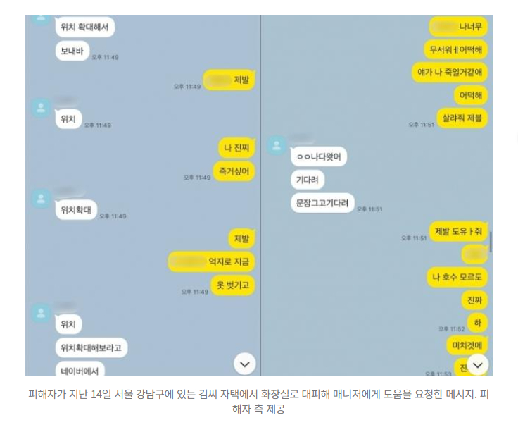 据悉,B某因犯罪行为发生后的散布威胁而遭受了极大的精神冲击,并前往急诊室接受了治疗。事发时B某向经纪人求助发送的KakaoTalk消息,记录了当时的紧迫情况。根据警方掌握的消息内容,B某在被困于金某家中时,以洗澡为借口进入卫生间,打开水龙头制造噪音,然后发消息求救:"他们不让我出去"、"我感觉会死,救救我"。