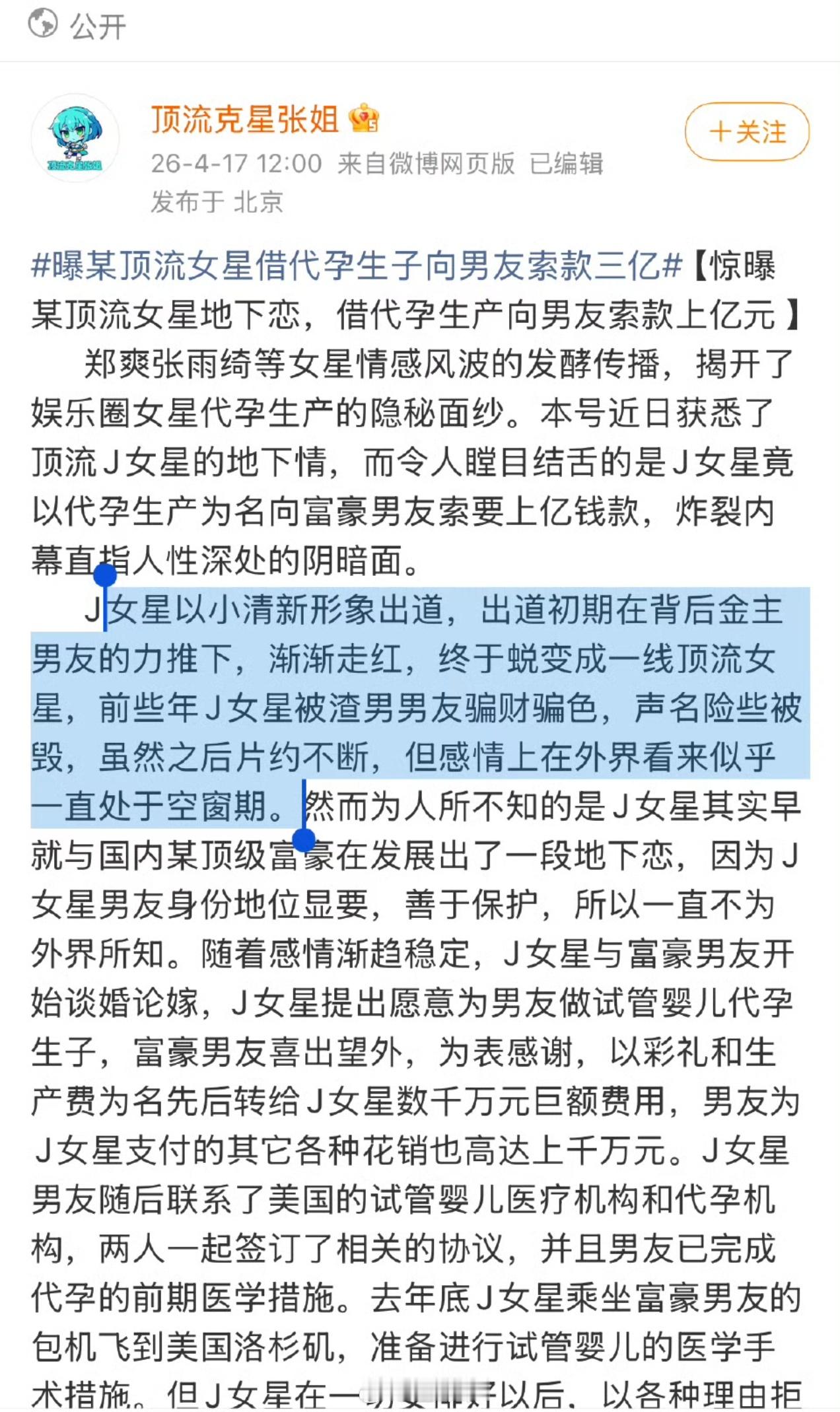 曝顶流女星借代孕生子向男友索要3亿所以会是谁?还是又瞎编造谣?
