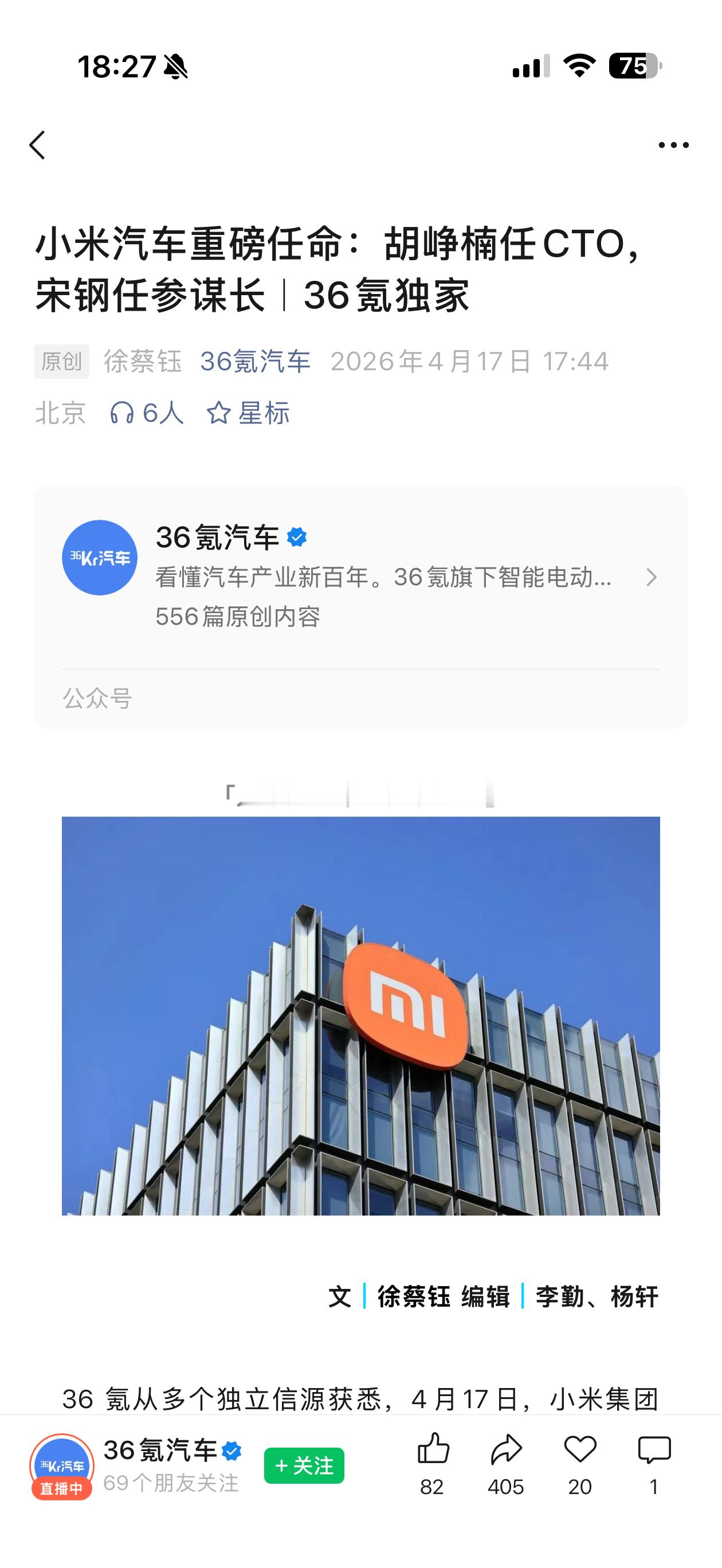 广而告之:胡峥楠出任小米集团副总裁、汽车部 CTO;这是小米汽车自 2021 年