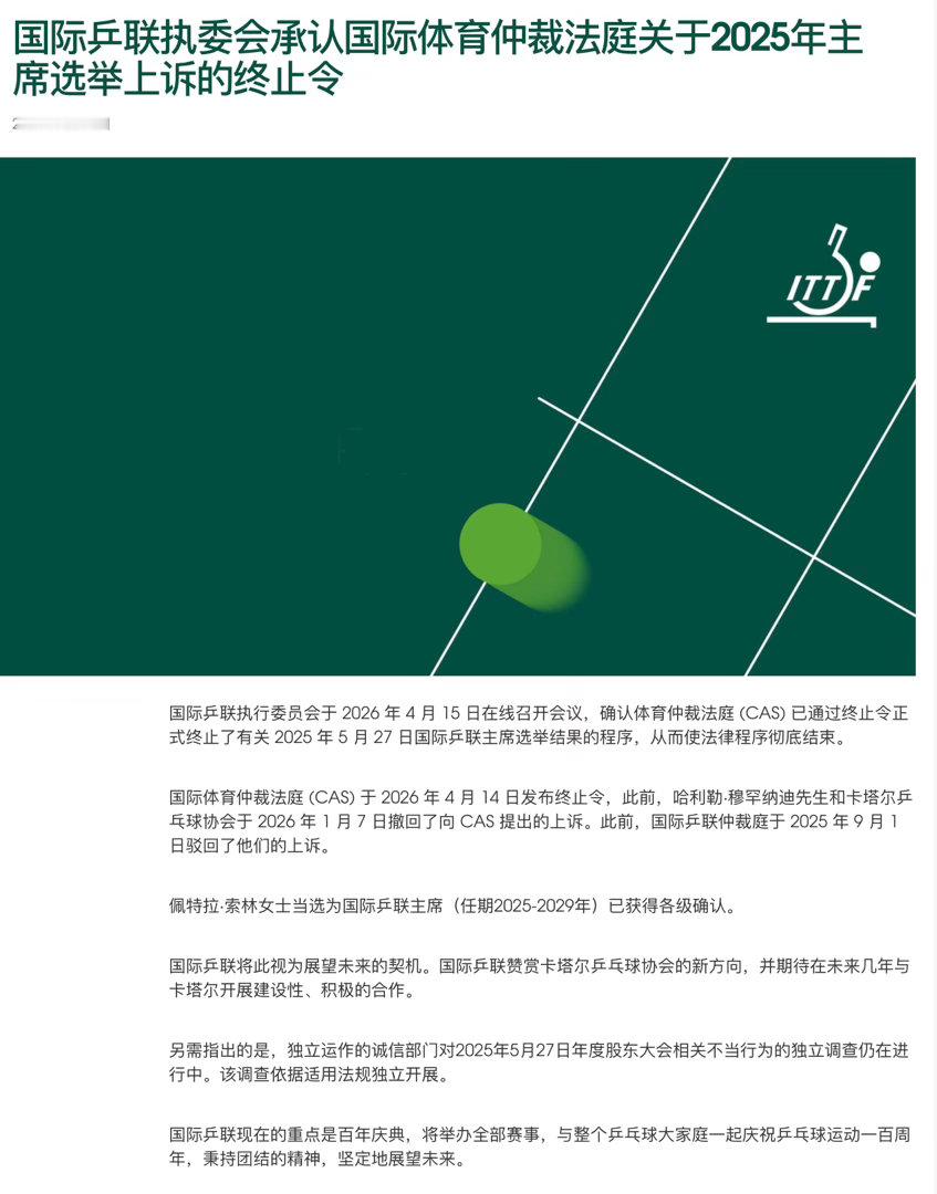 索林确认当选国际乒联主席据国际乒联官网,国际乒联执委会于2026年4月15日召开线上会议,确认国际体育仲裁院(CAS)已通过终止令正式终结针对2025年5月27日国际乒联主席选举结果的相关程序,相关法律流程至此正式全部结束。