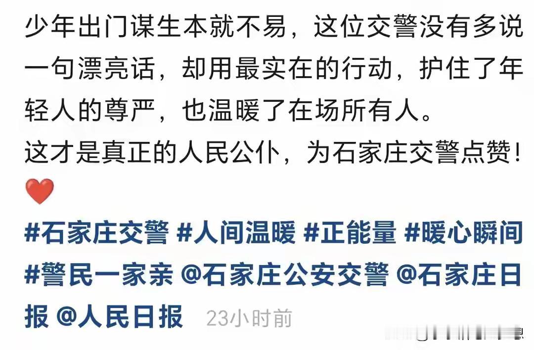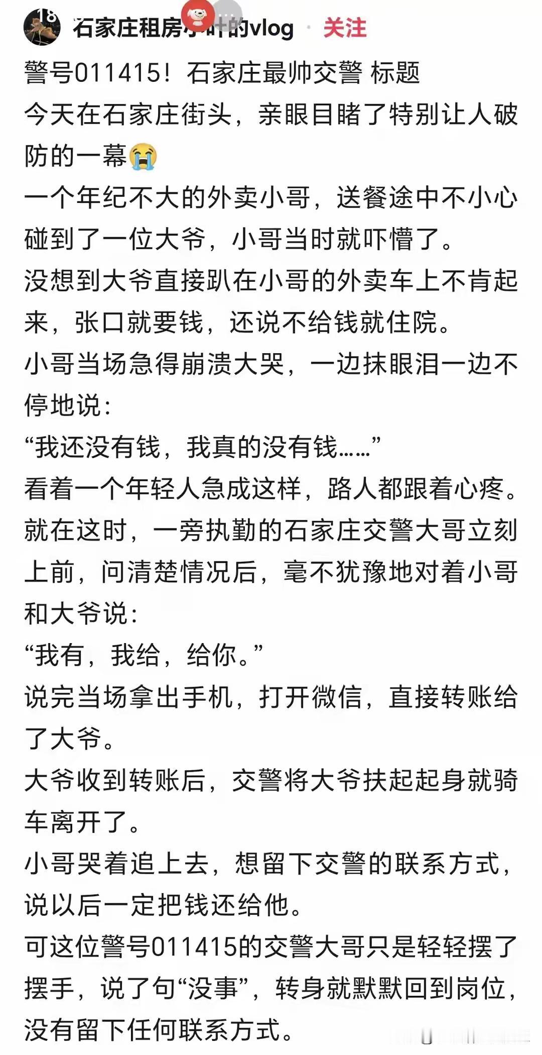 全网刷屏的暖心交警终于找到了!警号011415的焦亚楠,这一次出手,戳中了无数打工人的软肋。 街头一场小剐蹭,老人要求赔偿,外卖小哥当场崩溃大哭。很多人不解:不就是几百块钱,至于哭成这样?背后真相,让人心酸到窒息。这位小哥孤身在外打拼,所有收入全都用来给患病女友治病,口袋里连两百块都拿不出来。一边是责任要赔,一边是生活绝境,成年人的崩溃,往往就在这一瞬间。 就在小哥手足无措、四处借钱无果时,焦警官没有冷眼旁观,一边耐心和老人协商,把赔偿从600元降到200元,随后一句“我有,我给”,当场扫码垫付。小哥追着要还钱,他摆摆手拒绝:不用了,你也不容易。 这短短一句话,比任何说教都有力量。我们总说外卖员骑车快、不守规矩,可谁看见他们被算法追赶、被生活压得喘不过气?谁懂他们不敢生病、不敢出错、连意外都赔不起的窘迫? 这世上没有天生的坚强,只有被生活逼出来的逞强。焦警官垫付的不只是200块钱,更是一个普通人的尊严,是寒冬里最暖的光。 生活很难,但总有人偷偷守护着你。愿每一个努力奔跑的人,都能被温柔以待;愿每一份善良,都能被看见、被传递。