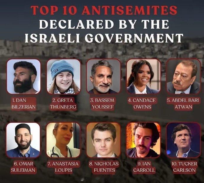以色列这是要干什么,想搞江湖追杀令吗? 十大反犹人物排行榜。 塔克卡尔森要加油啊,环保小公主都排在第二位。 如果这个榜单上的人真的死了一个的话,以色列可能会被开除球籍。 因为可能大家都不能忍受这样的一个国家在这个世界 存在了。 要是真的是这样,现在那些高呼 以色列文明的人该怎么办呢? 点右上角关注我,我们一起去看这个魔幻的世界
