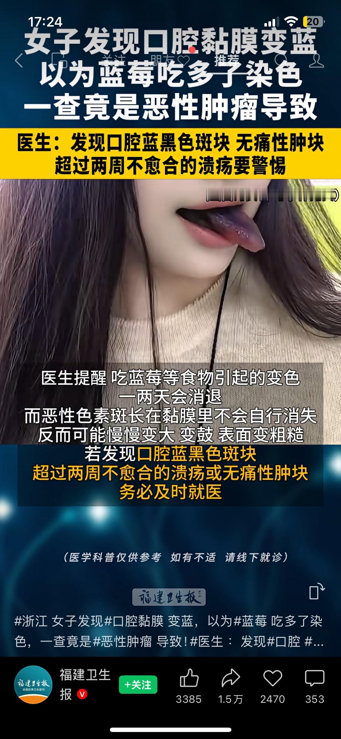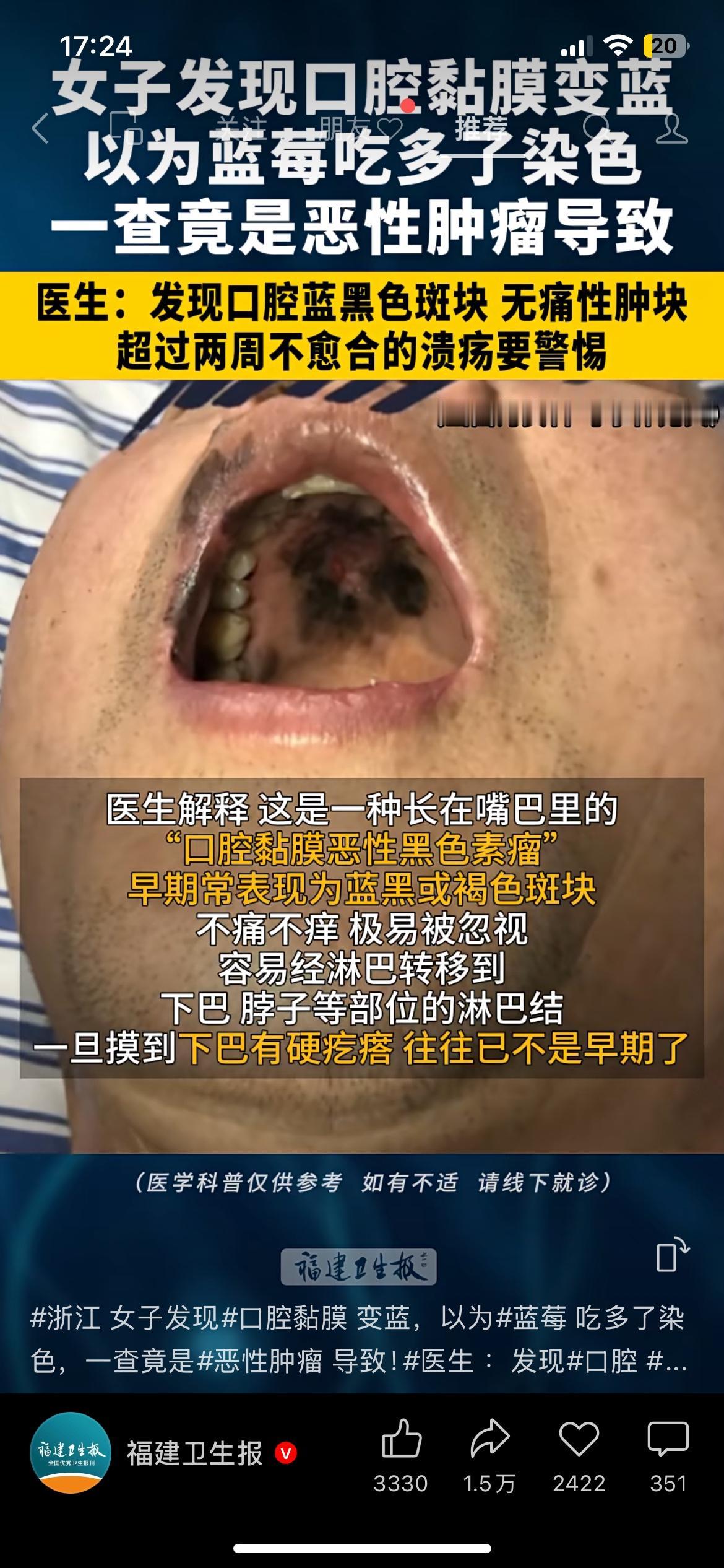 以为是蓝莓染色,结果是恶性肿瘤!口腔黏膜变蓝别大意 浙江一位女士发现口腔黏膜变蓝,一开始以为是吃蓝莓染的色,没放在心上,结果检查后确诊为口腔黏膜恶性黑色素瘤。医生提醒,食物染色一般一两天就会消失,异常斑块不会自行消退。出现口腔黑蓝色斑块、长期不愈合溃疡,一定要尽快就医。 健康提醒 口腔健康 恶性肿瘤