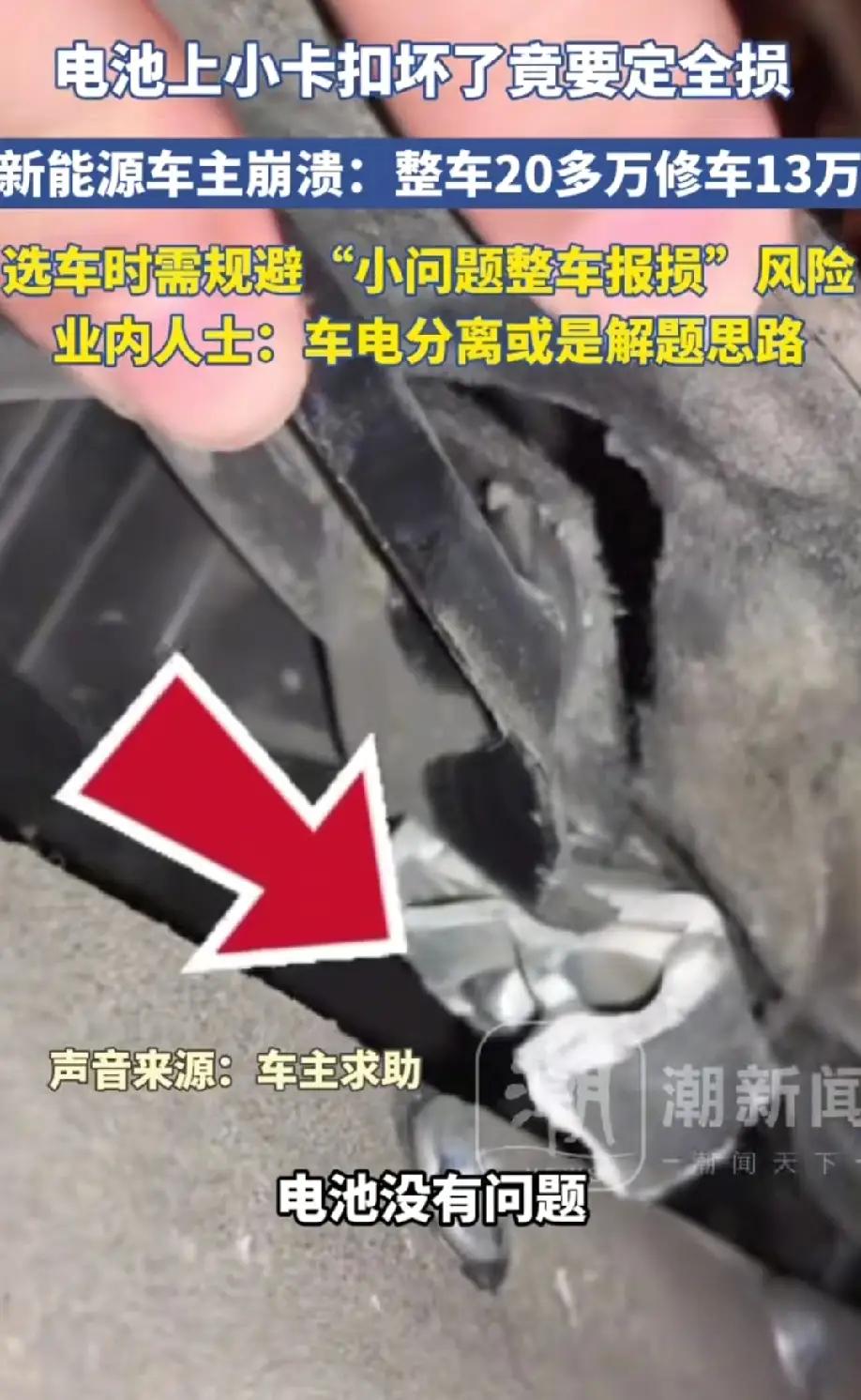 谁能想到,一辆落地二十多万的新能源车,就因为电池包上一个指甲盖大的小卡扣断裂,4S店直接开出13万天价账单,车主当场崩溃:这哪是修车,分明是抢钱! 车主刚提车不到一个月,正常行驶底盘轻微磕碰,检查后仅电池外壳固定卡扣损坏。本以为几十块就能搞定,却被告知卡扣与电池包一体成型,不单独售卖配件,只能整块更换电池。13万,几乎是半台车的价格,换谁都无法接受。 找厂家维权,得到冰冷回复:设计如此,无法单独维修;找保险公司理赔,对方不愿承担高额电池费用,最终只能按车辆全损处理。车主不仅失去新车,自己贴的车膜、改装的配件近万元损失,全打了水漂。 这不是个例,而是新能源行业普遍存在的维修垄断乱象。为了密封性与一体化设计,车企把电池包做成“不可拆解总成”,小零件坏了就得换整套,把成本全转嫁给消费者。买电车时夸口省钱,修起来却让车主一夜回到解放前。 看似是一个卡扣的问题,本质是行业对车主权益的漠视。我们支持新能源发展,但绝不接受被“只换不修”绑架。希望监管重拳出击,打破技术垄断,强制开放零部件供应,别让车主为不合理设计买单! 看完你还敢买电车吗?你遇到过维修刺客吗?评论区说说你的经历!