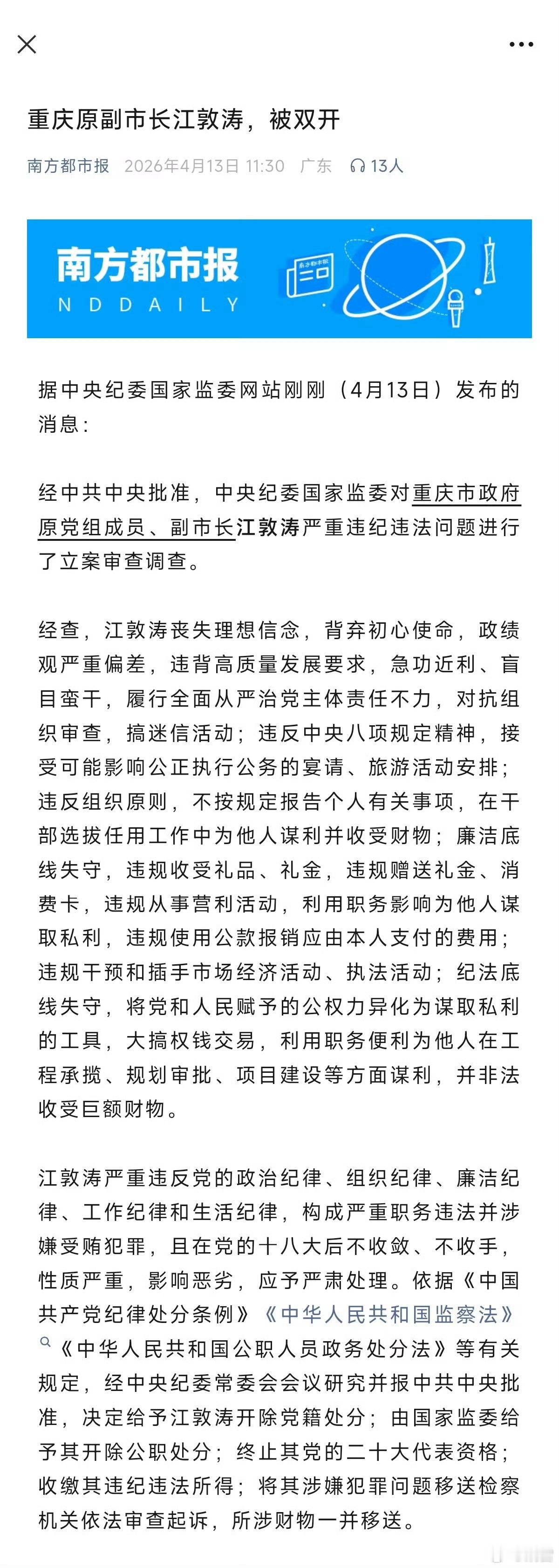 新华社:罗蔺涉嫌严重违纪违法【罗蔺接受审查调查】重庆市委常委、两江新区区委书记罗蔺涉嫌严重违纪违法,目前正接受中央纪委国家监委纪律审查和监察调查。(中央纪委国家监委网站)