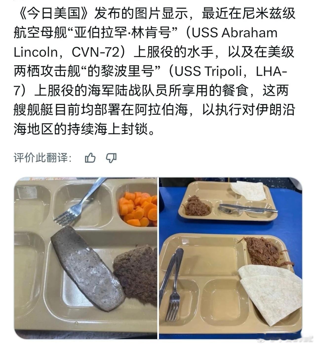 美军捉襟见肘的伙食除了装备,连战区的🦞龙虾饭都没有了。看看林肯号航母上的伙食,与开战前的“死亡盛宴”网页链接没法比图4。美军经费之匮乏,管理之混乱,可见一斑!