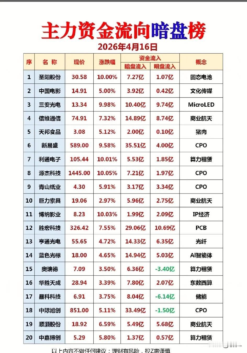 4月16日主力暗盘资金净流入top20梳理! 今日暗盘主力资金净流入覆盖CPO、算力租赁、商业航天、AI智能体、PCB等热门赛道。整体来看,科技主线资金热度极高,CPO、PCB、光通信等细分龙头暗盘资金大幅流入,部分个股呈现明盘流出、暗盘逆势吸筹的特征,赛道分化明显,科技主线资金集中度显著更高。 个股梳理分析 1. 圣阳股份:现价30.58元,涨幅10.00%,暗盘流入7.27亿,明盘流入1.07亿,涉及固态电池概念,资金大幅流入推动个股涨停,赛道资金关注度较高。 2. 中国电影:现价14.91元,涨幅5.00%,暗盘流入3.92亿,明盘流入0.42亿,属于文化传媒赛道,资金以暗盘流入为主,短线资金推动股价上涨。 3. 三安光电:现价13.34元,涨幅9.98%,暗盘流入10.40亿,明盘流入9.74亿,关联MicroLED概念,明暗盘资金同步大幅流入,个股接近涨停,赛道热度较高。 4. 信维通信:现价74.91元,涨幅7.32%,暗盘流入14.89亿,明盘流入8.74亿,主打商业航天概念,明暗盘资金均大幅流入,资金抢筹态势明显,股价涨幅显著。 5. 天邦食品:现价3.08元,涨幅5.12%,暗盘流入2.00亿,明盘流入0.10亿,涉及猪肉概念,资金以暗盘流入为主,获少量资金布局,股价实现小幅上涨。 6. 新易盛:现价589.00元,涨幅9.58%,暗盘流入35.51亿,明盘流入4.00亿,关联CPO概念,暗盘资金大幅流入,领涨CPO赛道,资金抢筹力度极强。 7. 利通电子:现价105.44元,涨幅10.01%,暗盘流入5.53亿,明盘流入1.85亿,主打算力租赁概念,明暗盘资金同步流入,推动个股涨停,赛道资金关注度高。 8. 源杰科技:现价1445.00元,涨幅10.05%,暗盘流入7.21亿,明盘流入1.97亿,涉及CPO概念,暗盘资金大幅流入,股价涨停,CPO赛道龙头获资金青睐。 9. 青山纸业:现价4.30元,涨幅5.91%,暗盘流入3.17亿,明盘流入3.34亿,关联CPO概念,明暗盘资金同步流入,CPO赛道低价标的获资金关注,股价上涨。 10. 巨力索具:现价19.06元,涨幅2.97%,暗盘流入5.96亿,明盘流入2.75亿,主打商业航天概念,明暗盘资金均有流入,资金布局支撑股价实现小幅上行。 11. 博纳影业:现价8.23元,涨幅10.03%,暗盘流入1.99亿,明盘流入2.09亿,关联IP经济概念,明暗盘资金同步流入,推动个股涨停,文化传媒赛道热度回升。 12. 胜宏科技:现价326.42元,涨幅7.55%,暗盘流入29.06亿,明盘流入10.69亿,主打PCB概念,明暗盘资金大幅流入,PCB赛道龙头获资金抢筹,股价涨幅显著。 13. 亨通光电:现价55.65元,涨幅4.72%,暗盘流入14.33亿,明盘流入6.35亿,涉及光纤概念,明暗盘资金均大幅流入,光通信赛道获资金布局,股价稳步上涨。 14. 蓝色光标:现价18.00元,涨幅4.65%,暗盘流入14.94亿,明盘流入5.03亿,关联AI智能体概念,明暗盘资金同步流入,AI赛道获资金关注,股价小幅上涨。 15. 奥瑞德:现价7.09元,涨幅3.50%,暗盘流入6.36亿,明盘流出3.40亿,主打算力租赁概念,呈现明盘资金流出、暗盘逆势吸筹特征,主力低位布局明显。 16. 华胜天成:现价28.94元,涨幅3.39%,暗盘流入7.80亿,明盘流入2.07亿,涉及东数西算概念,资金以暗盘流入为主,算力相关赛道获资金关注,股价小幅上行。 17. 晶科科技:现价6.91元,涨幅3.75%,暗盘流入8.04亿,明盘流出6.14亿,关联储能概念,明盘资金流出但暗盘逆势大幅流入,主力低位吸筹意图明显。 18. 中际旭创:现价851.00元,涨幅5.11%,暗盘流入33.49亿,明盘流出1.50亿,主打CPO概念,暗盘资金大幅流入,明盘小幅流出,CPO龙头获资金深度布局。 19. 顺灏股份:现价18.92元,涨幅6.59%,暗盘流入5.49亿,明盘流入5.68亿,关联商业航天概念,明暗盘资金同步大幅流入,商业航天赛道获资金推动上涨。 20. 中嘉博创:现价5.29元,涨幅5.80%,暗盘流入1.37亿,明盘流入0.57亿,主打算力租赁概念,资金以暗盘流入为主,算力赛道低价标的获资金关注,股价上涨。 总结 整体来看,今日暗盘资金流向榜单高度聚焦科技主线,CPO、PCB、光通信、算力租赁等AI相关赛道的龙头个股成为资金抢筹核心,多数标的明暗盘资金同步大幅流入,部分个股呈现明盘流出、暗盘吸筹的特征,显示出主力资金对科技成长方向的深度布局意愿,赛道热度分化明显,科技主线资金集中度显著高于其他板块。 本文涉及资讯内容来自网络公共信息,仅供参考不构成投资建议!