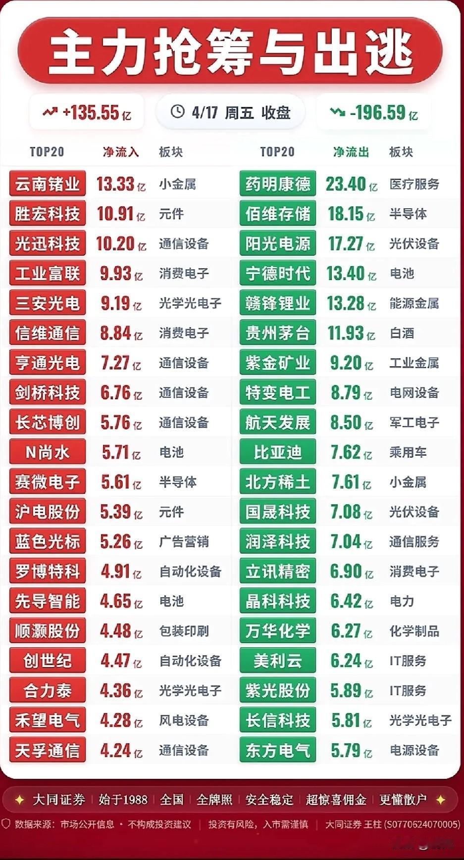 4月17日收盘主力资金净流入/流出个股梳理! 今日主力资金整体净流入135.55亿、净流出196.59亿,市场资金分化显著。通信设备、电子元件、小金属等科技赛道成为资金抢筹主力,而医疗服务、光伏、电池、白酒等板块遭大额资金出逃,风格切换特征明显。 净流入个股梳理 1. 云南锗业:净买入13.33亿,所属小金属板块,位列净流入榜首位,资金抢筹力度极强,是赛道核心标的。 2. 胜宏科技:净买入10.91亿,元件板块PCB龙头获大额资金流入,是电子元件赛道的资金核心标的。 3. 光迅科技:净买入10.20亿,通信设备板块光通信龙头获资金大幅流入,赛道热度持续。 4. 工业富联:净买入9.93亿,消费电子板块算力代工龙头获大额资金流入,赛道资金关注度高。 5. 三安光电:净买入9.19亿,光学光电子板块,MicroLED标的获资金大幅流入,赛道热度回升。 6. 信维通信:净买入8.84亿,消费电子板块射频与商业航天标的获资金流入,抢筹明显。 7. 亨通光电:净买入7.27亿,通信设备板块光纤光通信标的获大额资金流入,赛道持续受关注。 8. 剑桥科技:净买入6.76亿,通信设备板块CPO光模块标的获资金流入,AI通信龙头受青睐。 9. 长芯博创:净买入5.76亿,通信设备板块光电子器件标的获资金流入,细分龙头获布局。 10. N尚水:净买入5.71亿,电池板块新股标的获资金大幅流入,成为短期资金热点。 11. 赛微电子:净买入5.61亿,半导体板块MEMS标的获资金流入,半导体赛道获资金关注。 12. 沪电股份:净买入5.39亿,元件板块PCB标的获资金流入,电子元件赛道标的获小幅抢筹。 13. 蓝色光标:净买入5.26亿,广告营销板块AI营销标的获资金流入,AI应用赛道持续受关注。 14. 罗博特科:净买入4.91亿,自动化设备板块工业自动化标的获资金流入,智能制造赛道获布局。 15. 先导智能:净买入4.65亿,电池板块锂电设备龙头获资金流入,电池设备标的获关注。 16. 顺灏股份:净买入4.48亿,包装印刷板块商业航天标的获资金流入,跨界题材受短线关注。 17. 创世纪:净买入4.47亿,自动化设备板块智能制造标的获资金流入,工业自动化赛道获布局。 18. 合力泰:净买入4.36亿,光学光电子板块显示电子标的获资金流入,光学赛道标的获关注。 净流出个股梳理 1. 药明康德:净卖出23.40亿,医疗服务板块,位列净流出榜首位,资金出逃力度极强。 2. 佰维存储:净卖出18.15亿,半导体板块存储芯片标的遭大额资金流出,赛道标的遭抛售。 3. 阳光电源:净卖出17.27亿,光伏设备板块逆变器龙头遭大额资金流出,新能源标的遭抛售。 4. 宁德时代:净卖出13.40亿,电池板块锂电龙头遭大额资金流出,电池赛道核心标的遭出逃。 5. 赣锋锂业:净卖出13.28亿,能源金属板块锂矿龙头遭大额资金流出,能源金属标的遭抛售。 6. 贵州茅台:净卖出11.93亿,白酒板块白酒龙头遭大额资金流出,消费赛道标的遭抛售。 7. 紫金矿业:净卖出9.20亿,工业金属板块有色龙头遭大额资金流出,工业金属标的遭抛售。 8. 特变电工:净卖出8.79亿,电网设备板块新能源电力标的遭资金流出,电网设备标的遭抛售。 9. 航天发展:净卖出8.50亿,军工电子板块军工标的遭资金流出,军工赛道标的遭抛售。 10. 比亚迪:净卖出7.62亿,乘用车板块新能源汽车龙头遭资金流出,整车赛道标的遭抛售。 11. 北方稀土:净卖出7.61亿,小金属板块稀土龙头遭资金流出,小金属赛道标的遭抛售。 12. 国晟科技:净卖出7.08亿,光伏设备板块光伏组件标的遭资金流出,光伏赛道标的遭抛售。 13. 润泽科技:净卖出7.04亿,通信服务板块数据中心标的遭资金流出,通信服务标的遭抛售。 14. 立讯精密:净卖出6.90亿,消费电子板块消费电子龙头遭资金流出,电子赛道标的遭抛售。 15. 晶科科技:净卖出6.42亿,电力板块新能源电力标的遭资金流出,电力赛道标的遭抛售。 16. 万华化学:净卖出6.27亿,化学制品板块化工龙头遭资金流出,化工赛道标的遭抛售。 17. 美利云:净卖出6.24亿,IT服务板块数据中心标的遭资金流出,IT服务赛道标的遭抛售。 18. 紫光股份:净卖出5.89亿,IT服务板块ICT龙头遭资金流出,IT服务赛道标的遭抛售。 总结 今日资金流向呈现明显的“科技主线集中流入、传统赛道集中流出”特征,通信设备、半导体、电子元件等AI相关赛道成为资金抱团方向,而医疗、光伏、消费等板块遭资金大幅撤离,市场风格向科技成长切换的信号明确。 本文涉及资讯内容来自网络公共信息,仅供参考不构成投资建议!