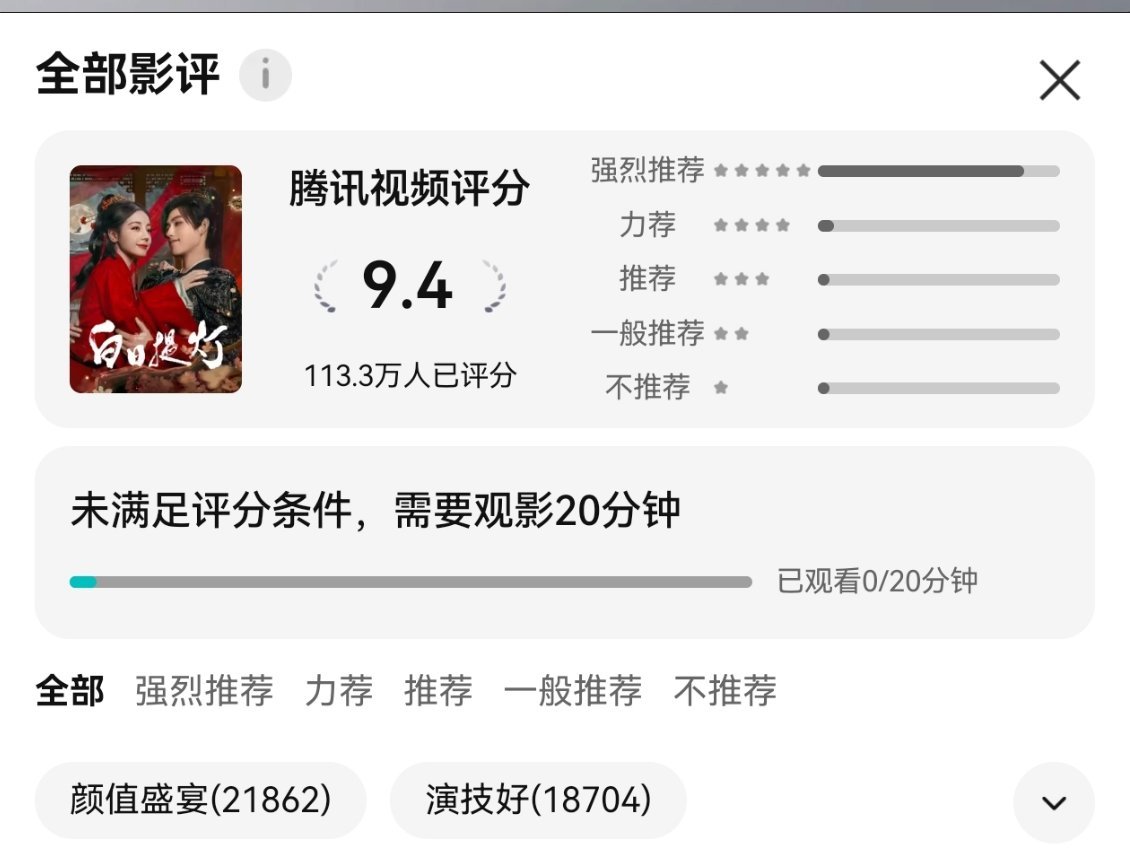 迪丽热巴陈飞宇白日提灯站内分数9.4白日提灯站内分数9.4迪丽热巴陈飞宇《白日提灯》腾讯站内评分9.4,113万人评分,评分条件需要观看20分钟,这个感觉才是更权威的分数吧?