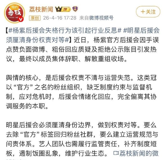 荔枝新闻:杨紫后援会失格行为该引起行业反思。