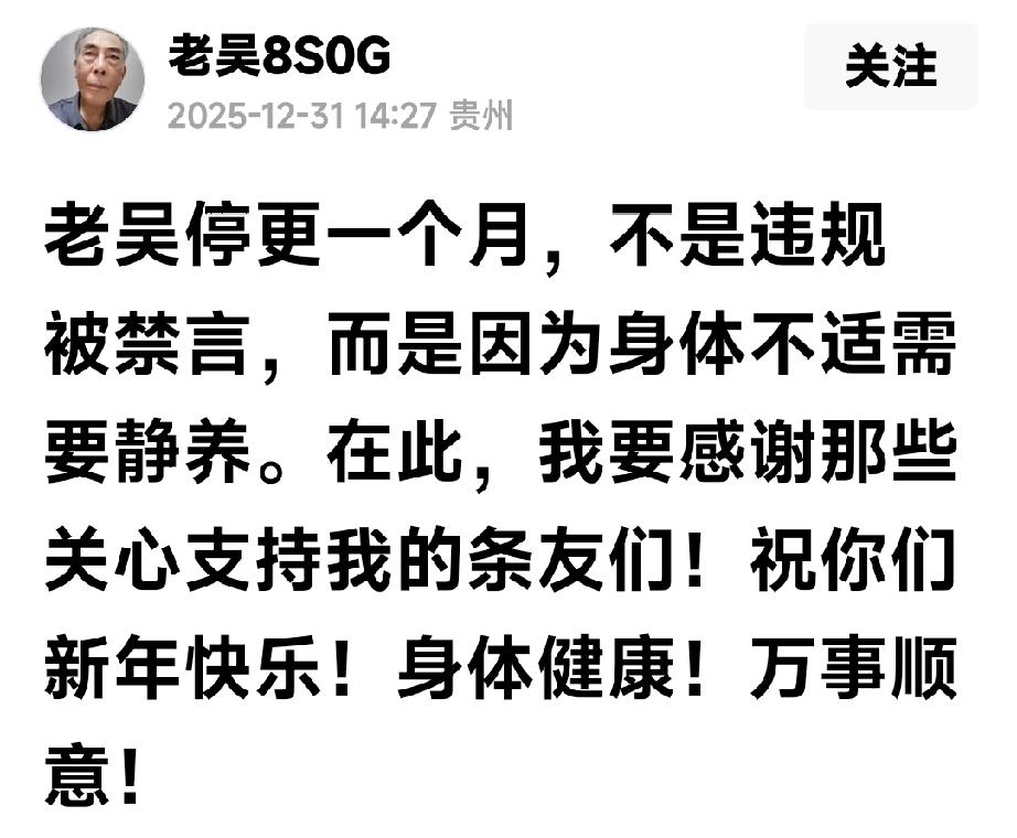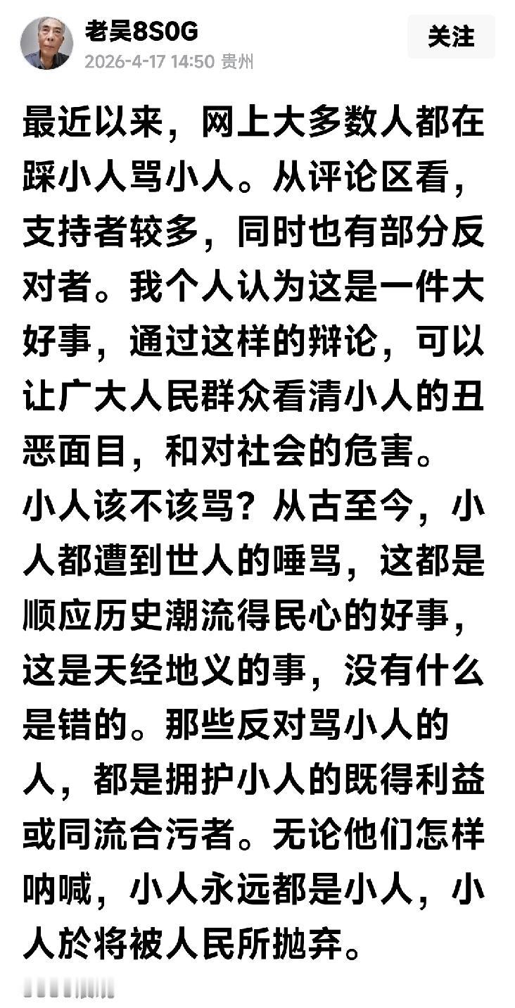 春天到了,万物复苏,老吴也开口说话了 网上有一位老吴先生,虽然已是年事已高,而且重病缠身,但依然斗争精力非常旺盛,他在网上除了回顾当年风生水起的岁月之外,基本上就是与人斗争,自己介绍曾经将光头翁斗得哑口无言,谢小碗败走麦城,还誓言“5数6害不消灭,没脸见为人”。 所以如果追寻他一生轨迹的话可能就是一个“斗”字,一直斗到现在,比如他在前面停更前的最后一篇文字,就是斗“公共支持分母”的: ——“公共知识分母又复出了,她换了一个更年轻漂亮的美女头像。*行天下吃肉,她不可能改变毒蛇的秉性!” 这个帖文写于2025年11月26日,然后奇怪的是老吴就突然停更了,一直到一个多月以后的2025年12月31日,老吴先生突然又发声: ——“老吴停更一个月,不是违规 被禁言,而是因为身体不适需要静养。在此,我要感谢那些关心支持我的条友们!祝你们新年快乐!身体健康!万事顺意!” 我对老吴了解比较多,知道他是一个非常要面子的人,比如老吴上世纪50年代就参军当兵,60年代参加工作,一直工作积极,有过许多的英雄事迹,好像事业上也很成功,70年代初就经常和贵阳市的大干部一起喝酒,他的同事都是正处级!但他却没有加入组织,他说一辈子没有写过申请书,主要是怕自己条件不够格,不给组织丢脸,你看老吴多有自知之明啊。 所以对老吴这一个多月的停更,我也相信他是不会违规的,更不会被禁言,年纪大了,身体不好,这个理由完全说得通。 不过,今天偶然到他的主页去看看,真的交了好运气,看到老吴沉寂几个月后又发文了,正好给我有幸看到了,当然依然是火药味十足: ——最近以来,网上大多数人都在踩小人骂小人。从评论区看,支持者较多,同时也有部分反对者。我个人认为这是一件大好事,通过这样的辩论,可以让广大人民群众看清小人的丑恶面目,和对社会的危害。 ——小人该不该骂?从古至今,小人都遭到世人的唾骂,这都是顺应历史潮流得民心的好事,这是天经地义的事,没有什么是错的。那些反对骂小人的人,都是拥护小人的既得利益或同流合污者。无论他们怎样呐喊,小人永远都是小人,小人於将被人民所抛弃。 从他文章的字里行间看,老吴应该不是无病呻吟,而是有所指的,当然具体指的什么我不知道,但知道他和毛星火一样正常都是代表广大人民群众的。 下面评论区支持老吴的人很多,但有一条评论很奇妙:“借题剑指清风客,我向左人该不该?请作者回答!”估计这位“忍冬藤潭”网友可能在什么地方和老吴有过交锋,不知道是不是讨论了“小人”和“左人”的问题,估计也是知道老吴底细的。 有兴趣的网友可以关注一下!