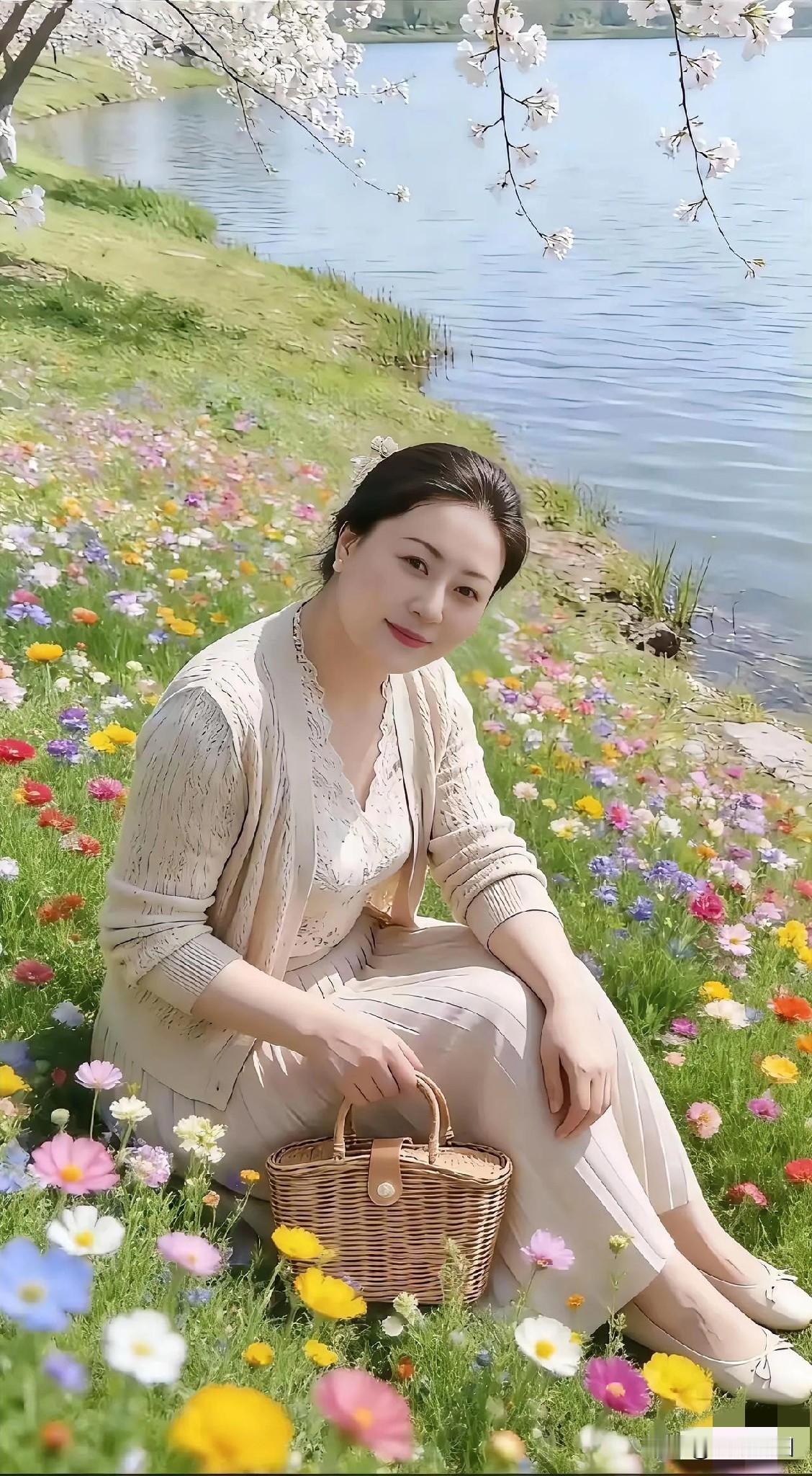 樱下佳人 樱花绽处映霞红, 树下佳人韵若虹。 云鬓轻垂添秀色, 蛾眉微蹙蕴情浓。