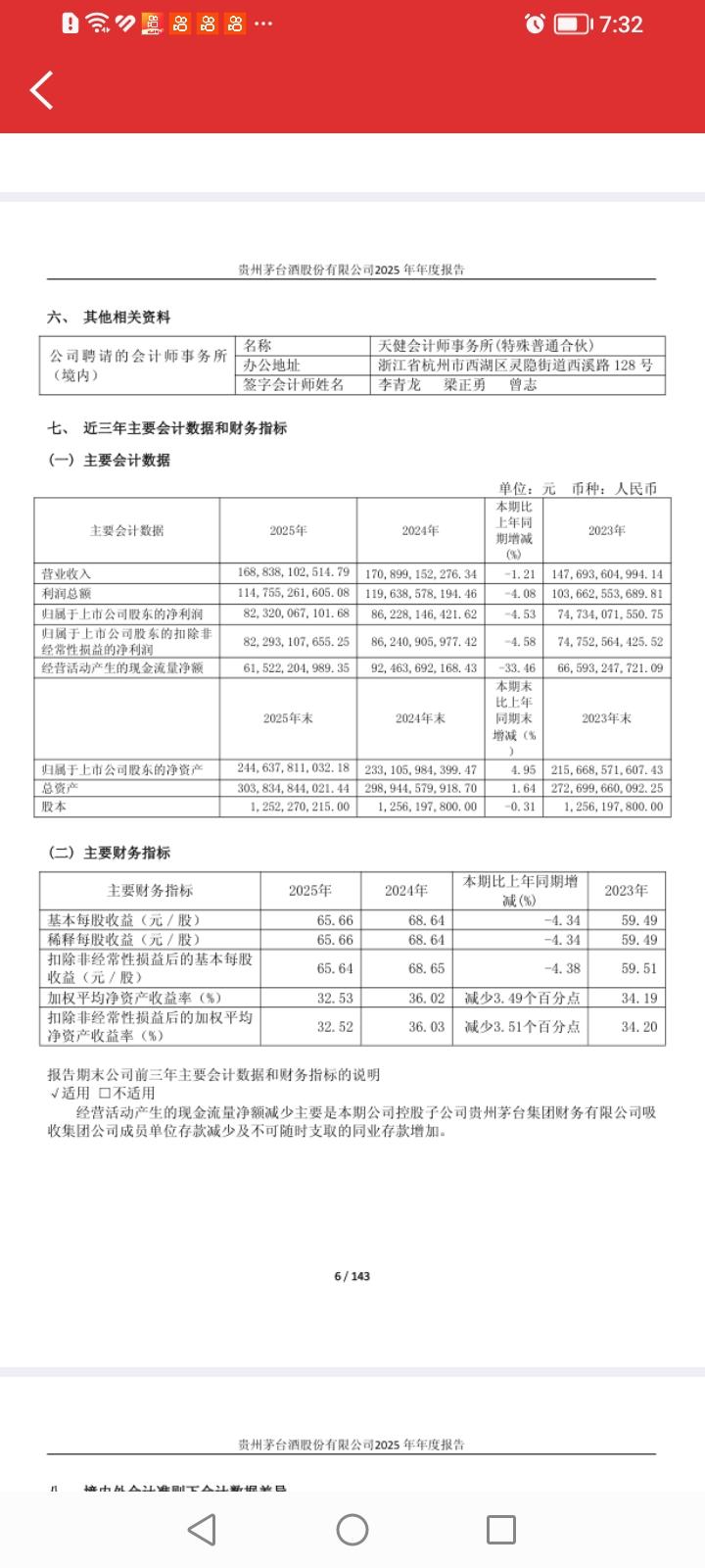 地主家也没有余粮了?茅台2025年也出现了主营业务收入和净利润同比双降了?是不是有点令人不敢相信? 昨晚贵州茅台披露了2025年年报,主营业务收入同比微降1.21%,归属净利润同比下降4.53%,在此消息刺激下,贵州茅台股价今天大幅低开,收盘大跌3.8%。 人无千日好,花无百日红。茅台业绩出现小幅波动似乎无须大惊小怪的。从今年i茅台线上销售情况看,茅台的市场化改革已收到量价齐升的较好成效了。 昨晚茅台2025年年报业绩披露后,有人惊呼茅台已经不是那个茅台了,7天后茅台将披露2026年一季报业绩后,可能有人又会惊呼:茅台还是那个茅台!有人做过试验,鱼的记忆只有七秒,股市的记忆是多久?可能也就是一天,过了今天,明天太阳照常升起! 危中有机,危中见机,可能有人已经在别人的恐惧中贪婪了。如果作风稳健点,似乎等一季报披露,业绩增长被证实后再建仓会更好。