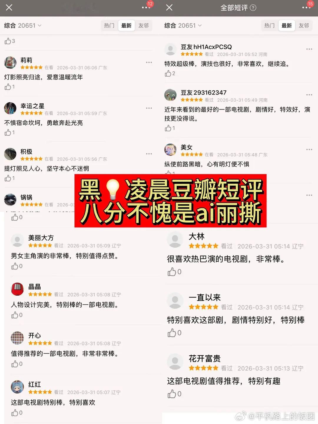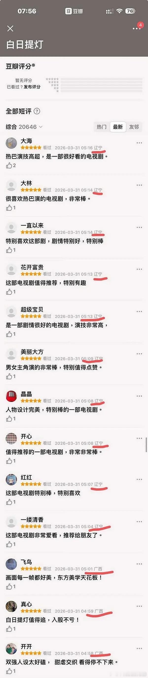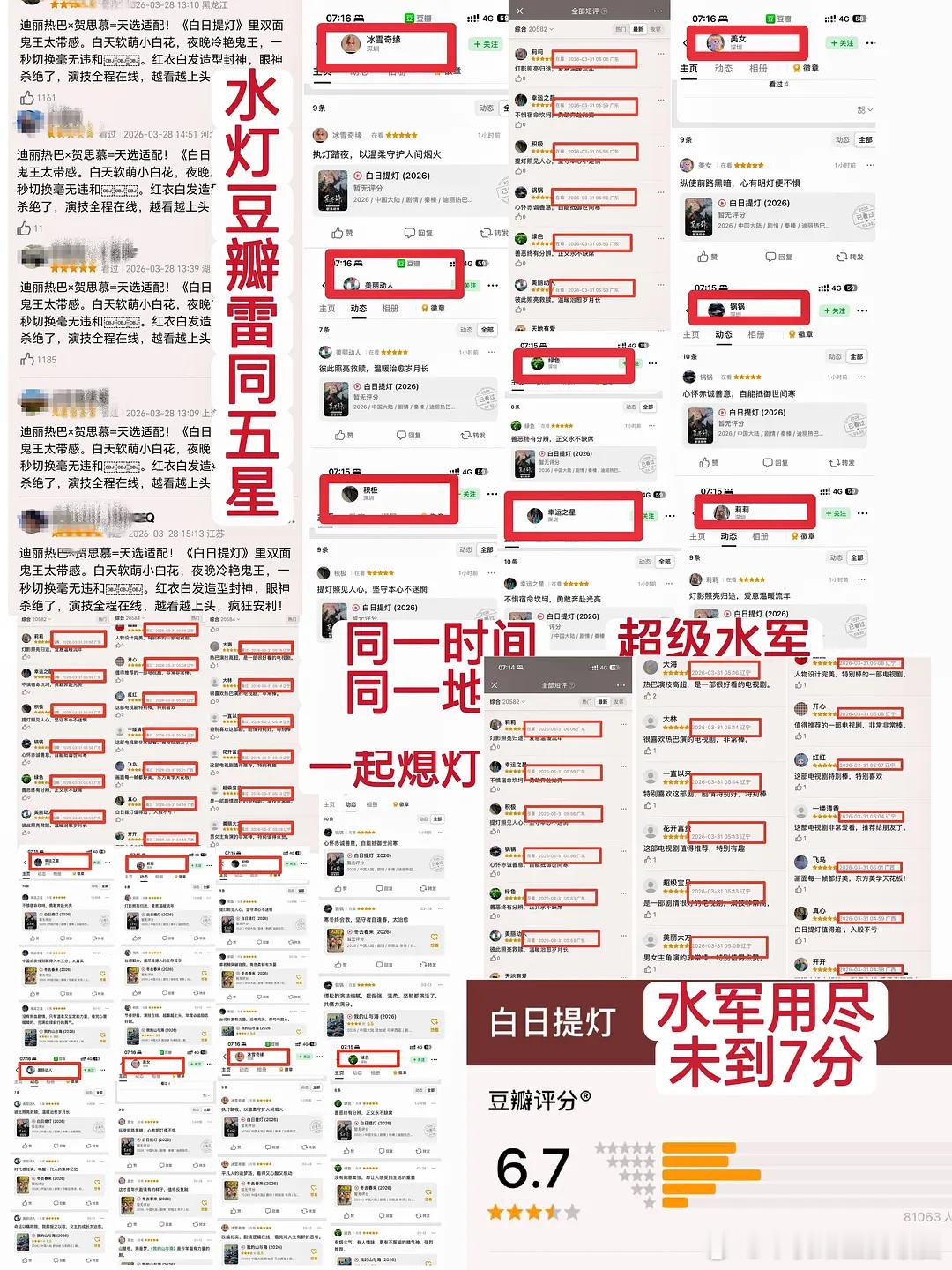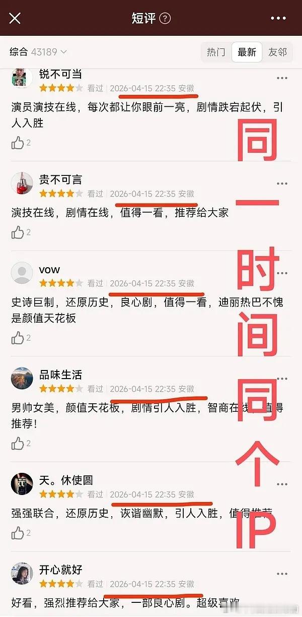 迪丽热巴陈飞宇主演的白日提灯被网友发现疑似在某打分平台买水军打高分,很多评论都是同一个ip同一个时间,你们怎么看