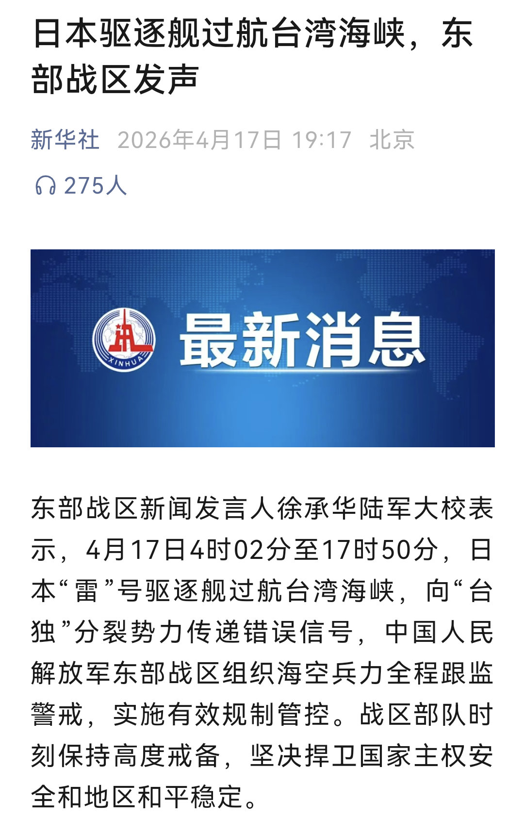 一日本自卫队舰艇进入台湾海峡日本驱逐舰过航台湾海峡,东部战区发声。