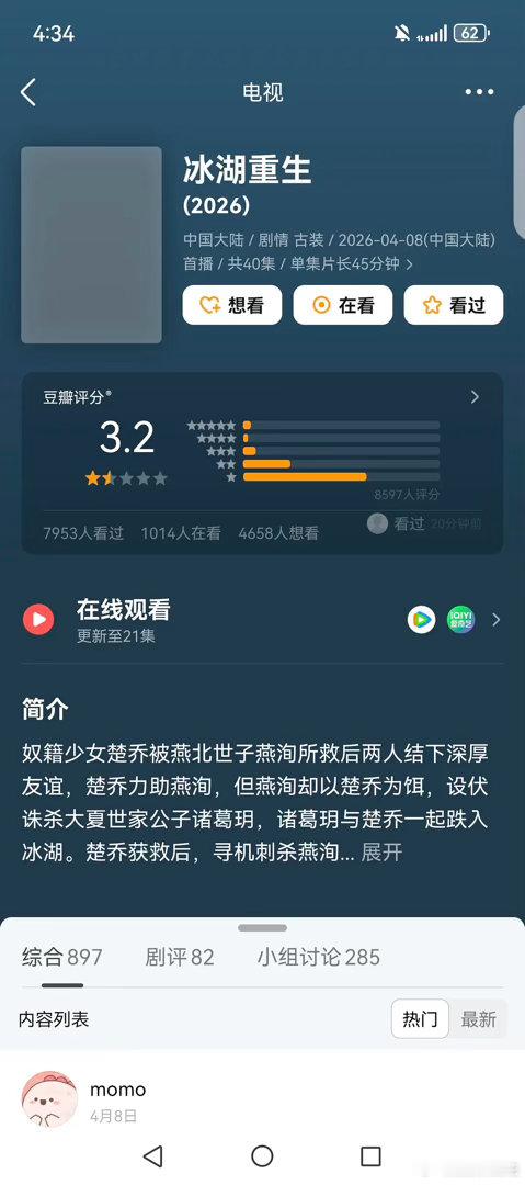 冰湖重生开分3.2 8000人评分,感觉这部剧从全方面都被不太行啊....