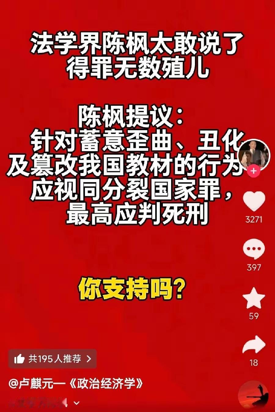 很多人说不敢说、不愿说,这次法学界的陈枫,真的一语戳中了无数国人心里最深的痛点。 如今这条提议被卢麒元转发之后,瞬间引爆全网,也戳到了不少人的痛处。 他提出,凡是蓄意歪曲、丑化、恶意篡改国家教材的行为,应当视同分裂国家相关重罪,情节极其严重的,最高可判死刑。 回想这些年,教材出问题的事情一而再、再而三刺痛大众的心。 很多面向孩子的课本,悄悄被改动、被扭曲,三观导向出偏差,文化立场被模糊。 最让人愤怒的是,很多幕后黑手最后往往只是轻微问责、简单处分,几乎没有沉重的法律代价。 惩罚太轻,才让一些人有恃无恐,一次次把手伸向孩子的精神土壤。 要知道,教材根本不是普通的书本,它是一代人价值观的根基,是民族文化传承的源头。 今天在课本里悄悄动一点手脚,明天就可能扭曲一代人的认知,动摇整个民族的文化根基。 往小了说是失职失德,往大了说,就是在动摇国家的根本、伤害民族的未来。 之前有极端篡改教材、传播分裂思想的相关案件,最终也是按重罪从严惩处,足以说明这件事的分量。 我们不是要苛责普通的工作疏漏,而是绝不能放过那些主观恶意、蓄意搞破坏的人。 教育容不得半点马虎,下一代的成长,更容不下任何别有用心的暗手。 如果连守护孩子课本底线的力度都不够,那所谓的文化自信、家国情怀,根本就是空谈。 现在大众之所以纷纷支持这个提议,本质上不是崇尚重刑,而是所有人都看清了:不严惩,就永远杜绝不了这类乱象。 只有拿出最严格的法律震慑,让触碰红线的人付出惨痛代价,才能真正守住校园净土,护好我们的下一代。 教育无小事,教材无小事,底线更不能有半步退让。 不知道屏幕前的你,怎么看待这份提议?你觉得对于恶意篡改教材的行为,该不该从严从重追责?来评论区聊聊你的看法。