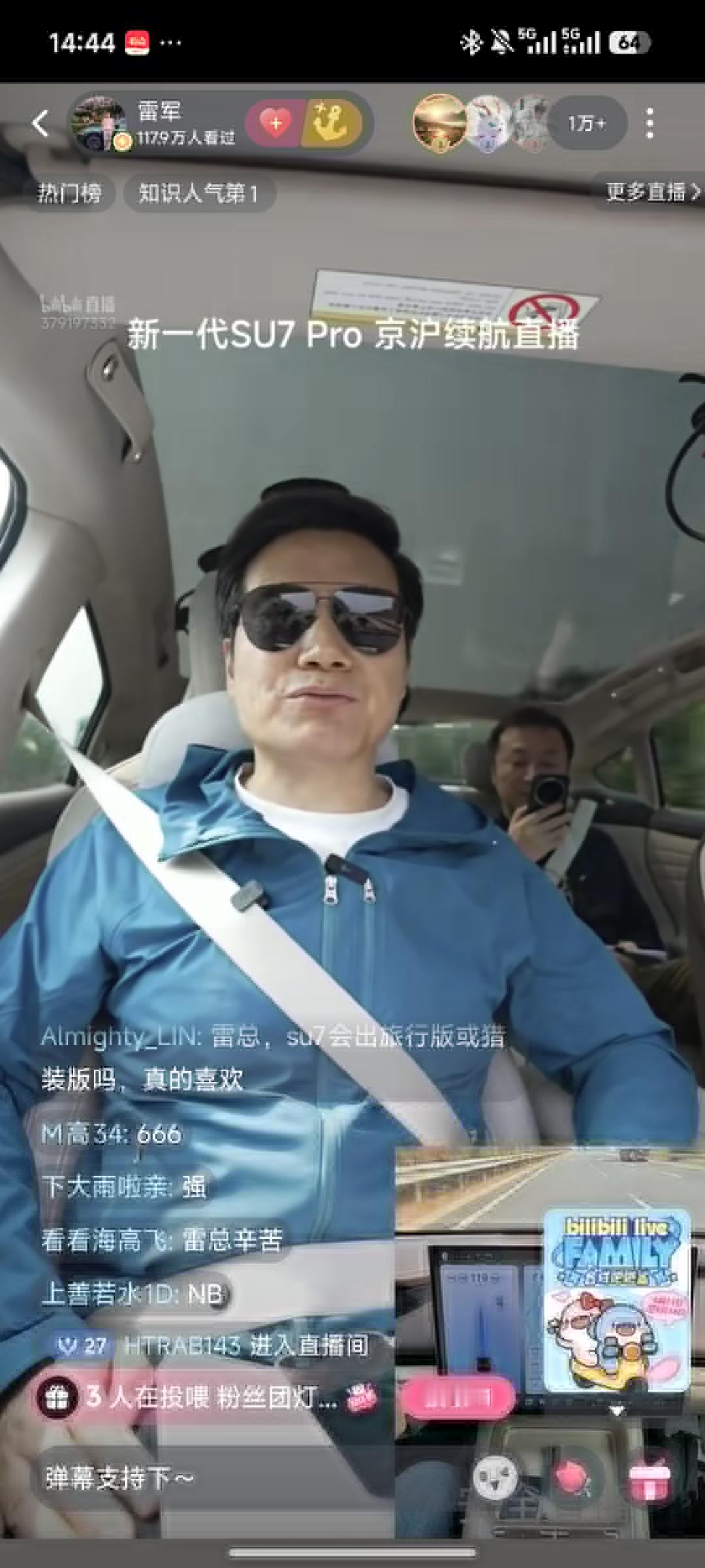 今天国内的朋友,全在看雷军直播。 原因是老哥,想挑战小米新 SU7 汽车,从北京连开 1265 公里到上海,期间只充一次电。 于是上亿大佬,带着高管,从早上 6 点开始全程直播,不断地跟网友互动和分享,一直中午跑到 630 公里,才在休息区给车充电,目前正继续跑完全程。 预计将连续直播 15 小时。
