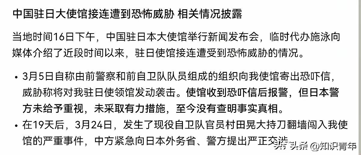 对日本的态度忍无可忍了!中国驻日大使馆举行新闻发布会,对日本施加压力!4月16日,中国驻日本大使馆举行新闻发布会,临时代办施泳向媒体表示,3月5日,自称由日本前警察和前自卫队队员组成的组织向使馆寄出恐吓信,威胁称将对中国驻日使领馆发动袭击,但日本警方未给予重视,未采取有力措施,至今没有查明事实真相。 在19天后,就发生了现役自卫队官员村田晃大持刀翻墙闯入中国使馆的严重事件。闯馆事件仅一周后,3月31日,又一名自称应急预备自卫官的人通过网络向使馆发出恐怖威胁,称其在中国使馆内安装了远距离遥控炸弹。我方表示,上述事件严重违反国际法,严重侵犯中国主权和尊严,要求日本要予以严肃处理和给出妥善应对。 事情发展到开新闻发布会公开施压,说明问题已经相当严重了。外交场合讲究对等和体面,一般不会把这种安全纠纷拿到台面上吵。中国使馆选择公开点名,意味着私下沟通可能已经无效,或者日方的敷衍态度让人无法再忍。这传递的信号很明确:中国的外交忍耐是有限度的,核心利益和安全底线不容挑战。 一连串事件指向同一个源头:日本国内某些势力对中国的敌意正在失控,而且得到了某种程度的纵容。恐吓信来自“前警察和前自卫队员”,闯馆的是现役自卫官,网络威胁的又是“应急预备自卫官”。涉事人员都和日本的暴力机关有千丝万缕的联系,这很难用“个人行为”或“偶然事件”来解释。更关键的是,日本警方的处理方式极其消极,收到恐吓信不重视,发生闯馆事件后调查拖沓,这种不作为本身就是在释放错误信号,变相鼓励了极端行为。 根据《维也纳外交关系公约》,驻在国有义务采取一切适当步骤保护外国使馆馆舍免受侵入或损害,防止一切扰乱使馆安宁或有损其尊严之情事。日本作为公约缔约国,其警方和政府的消极应对,已经涉嫌违反国际法义务。中国使馆的抗议,不仅是政治表态,更是站在坚实的国际法理基础上。日本如果继续装聋作哑,在国际社会上的法治国家形象会大打折扣。 这件事背后,是日本对华战略的矛盾和国内政治氛围的毒化。一方面,日本政府在经济上需要与中国合作;另一方面,又在安全上积极追随美国围堵中国,国内媒体常年渲染“中国威胁论”。这种分裂政策导致社会氛围恶化,一些右翼分子和极端民族主义者将中国视为敌国,把攻击中国外交机构当作“爱国”行为。日本政府对此态度暧昧,既想利用这股情绪为扩军备战找借口,又怕彻底激怒中国,结果就是管控失灵,酿成恶果。 中国的反应已经非常克制。没有立刻采取对等反制措施,而是先通过外交渠道正式提出交涉和要求。这是一种“先礼后兵”的姿态,给日本留下了纠正错误的时间和空间。但如果日方继续敷衍塞责,中方可用的工具还有很多,比如升级使馆的安保级别并公开质疑日本政府的保护能力,在双边高层会谈中将其列为优先议题,甚至依据对等原则,对日本在华使领馆的安全环境进行“合规性审查”。外交博弈的升级,往往是从这些具体事件的处置开始的。 这一事件也给所有在日中国机构和公民的安全敲响了警钟。当针对国家象征的外交机构都屡遭威胁时,普通中国公民和企业的安全感如何保障?日本政府如果不能有效遏制这股歪风,中日之间本就脆弱的政治互信将遭受进一步侵蚀,两国关系的“压舱石”会变得更加松动。区域稳定需要负责任的国家行为,而不是纵容极端民族主义情绪泛滥。 各位读者你们怎么看?欢迎在评论区讨论。