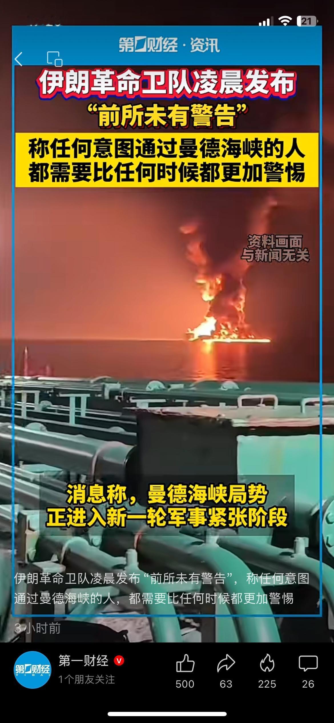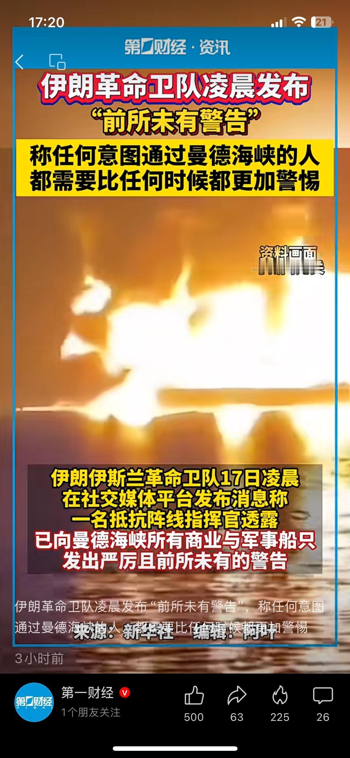 美军威胁动武!伊朗警告:敢在海峡指手画脚,就击沉美军舰 美军最近放话,凡是不配合封锁的船只,不管哪个国家都可能动用武力,还把封锁范围进一步扩大。伊朗这边态度也很强硬,高层直接警告美国,别在霍尔木兹海峡搞事,否则不排除击沉美军舰艇,革命卫队也发布了少见的安全预警。局势一紧张,油价和航运都跟着受影响。 美伊局势 霍尔木兹海峡 国际油价