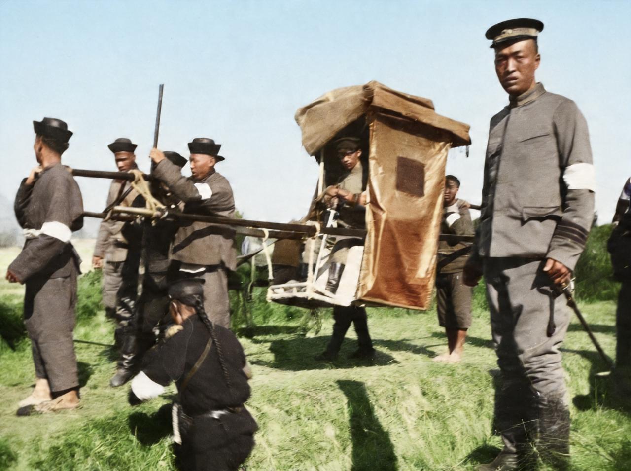 这是荫昌乘着一顶轿子到清末新军操练场地。新军将进行军事演练。荫昌乘坐的是四人抬的小轿。小轿非常简单并不出奇。荫昌身穿军装,头戴军帽,手拄军刀,掀开轿子前帘,向外看向镜头。一名新军士兵与一名警察负责保卫护送。 荫昌长期在军队中任职。之后,他一路高升,升至陆军大臣。对于国外的军事操练,荫昌相当熟悉。因为,他曾在德国军事学校学习军事操作技术一年,在留学期间,他还与德皇威廉二世为同班同学。 虽然,荫昌在军队中的职务步步高升,但他并没有真正指挥过军队,缺乏军队中的基础。他在军队中的职务非常高,但难以控制和指挥军队。因此,当他率军与南方军队作战时节节失利。他的军事指挥能力不足,但在军队中的威望一直很高。