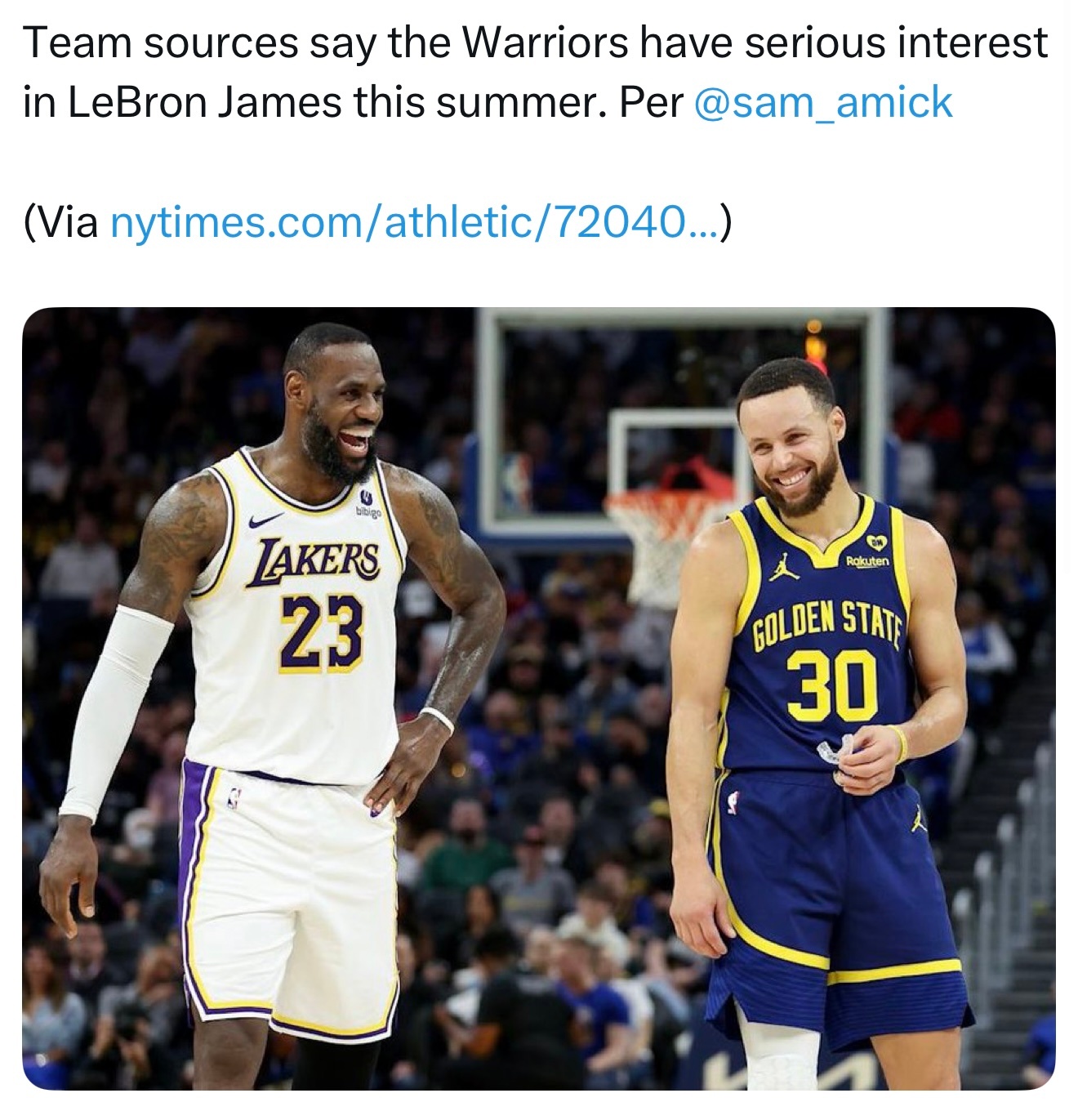 又来Sam Amick:球队消息人士称,勇士今年夏天将会认真追求詹姆斯。