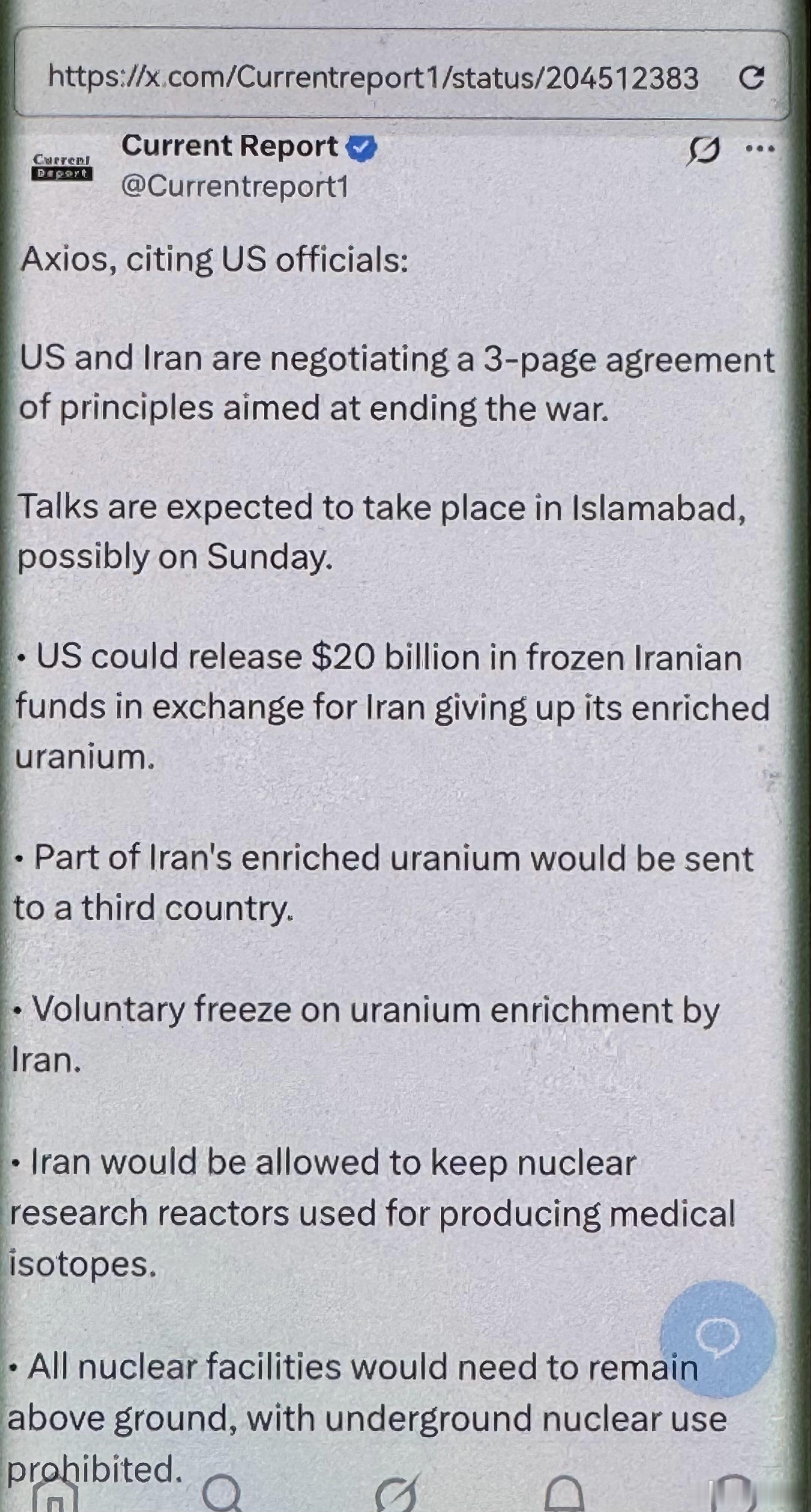 《今日美国》援引美国官员消息称:美国与伊朗正就一份旨在结束冲突的3页原则性协议展开谈判。谈判预计将于周日在伊斯兰堡举行。