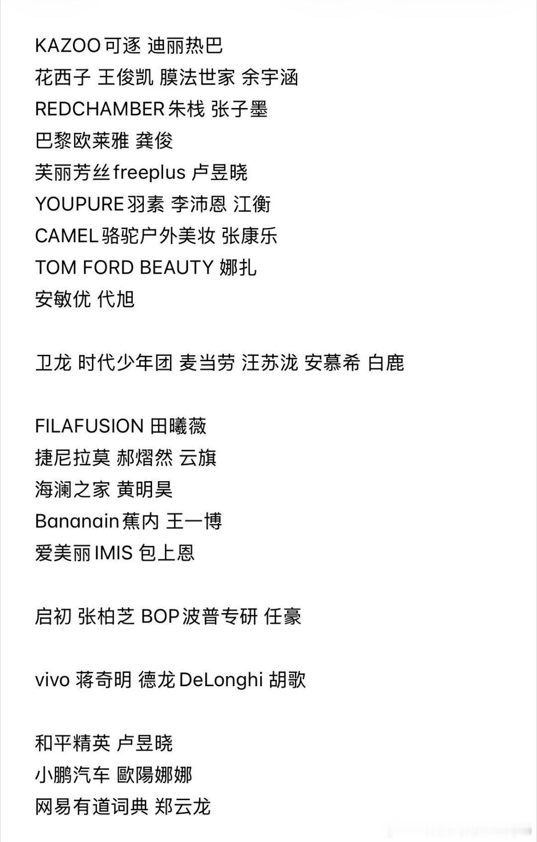 新宣&更新543REDCHAMBER朱栈青春品牌大使张子墨 多用膏PL品牌大使颜安 看不见防晒气垫维达品牌大使徐梦洁 洗脸巾2江衡李沛恩羽素净透代言人卫龙全球品牌代言人时代少年团 卫龙魔芋爽田曦薇FILAFUSION潮流代言人爱美丽趣味生活代言人包上恩草本初色夏日心动大使张予曦和平精英纱华大使卢昱晓有道词典学习会员代言人郑云龙1邓凯 孔雪儿巴黎欧莱雅防晒挚友 欧莱雅小金管防晒BABI品牌大使林枫松 定妆喷雾全友家居品牌大使谭松韵31鹿角巷春日代言人方逸伦云旗郝熠然捷尼拉莫亚太区品牌大使BOP波普专研品牌挚友任豪卡地亚全球品牌大使舒淇30迪丽热巴可逐全球品牌代言人 颈膜产品张康乐骆驼防晒青春代言人赫莲娜品牌新生大使章若楠 赫莲娜小露珠麦当劳甜品代言人汪苏泷黄明昊海澜之家元气夏日系列代言人王天辰PORTS宝姿男装品牌挚友