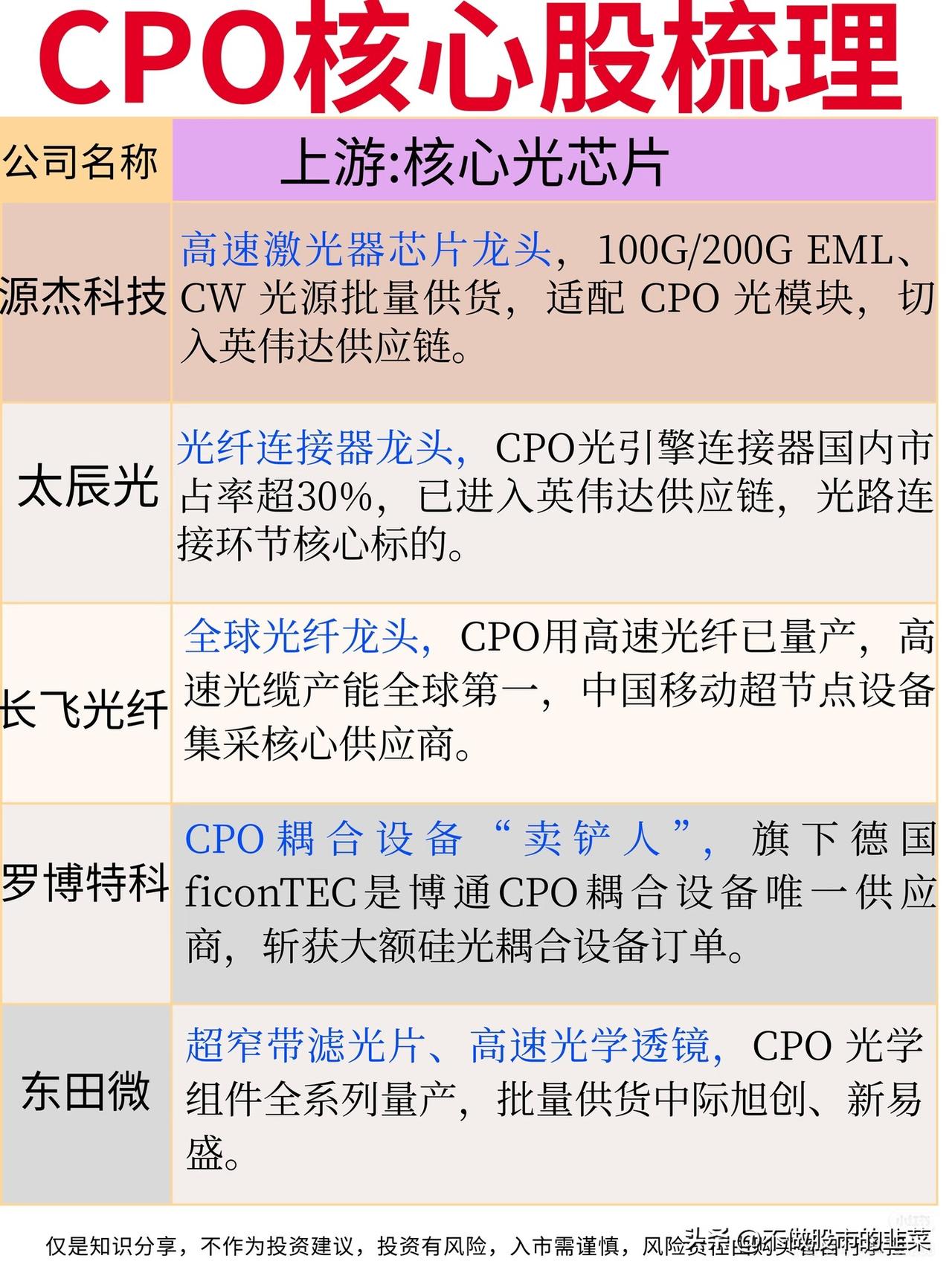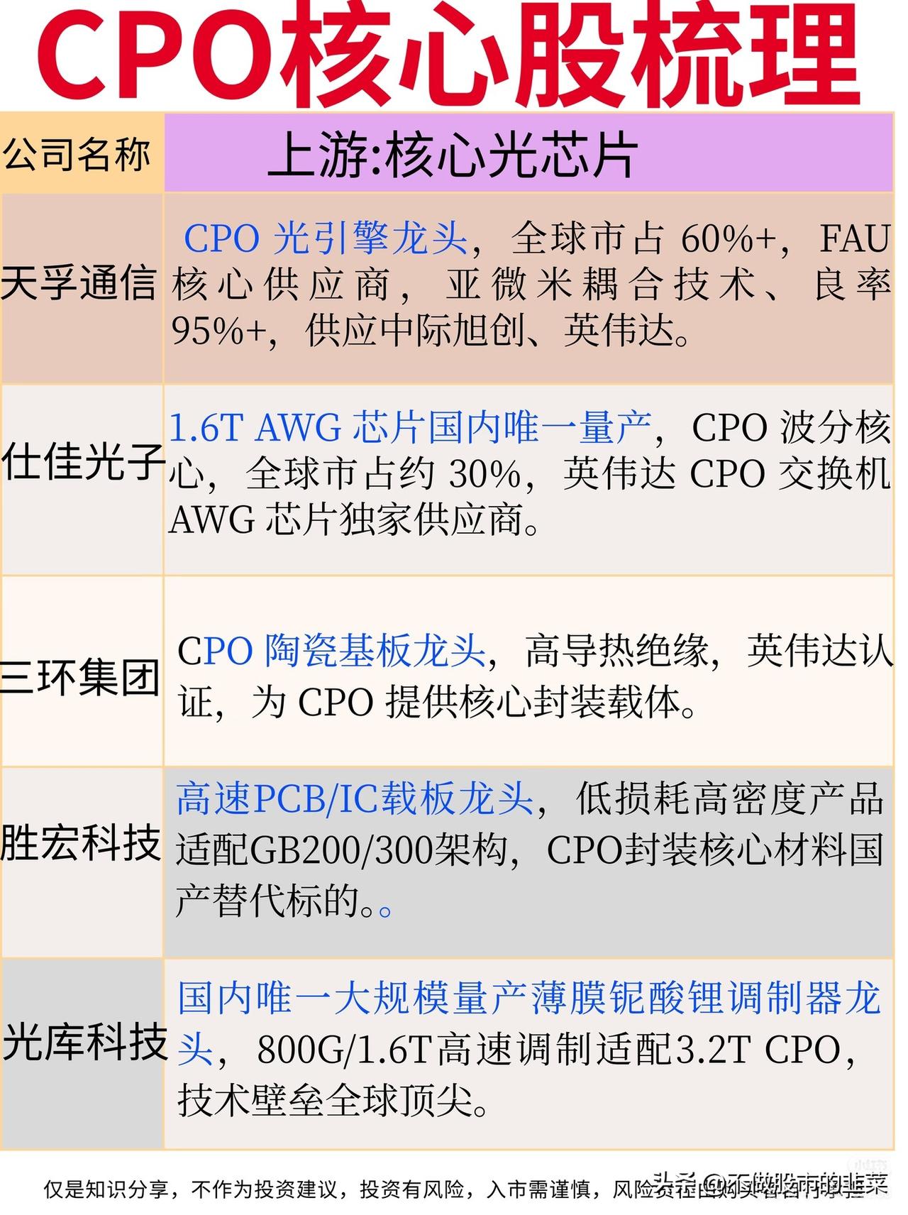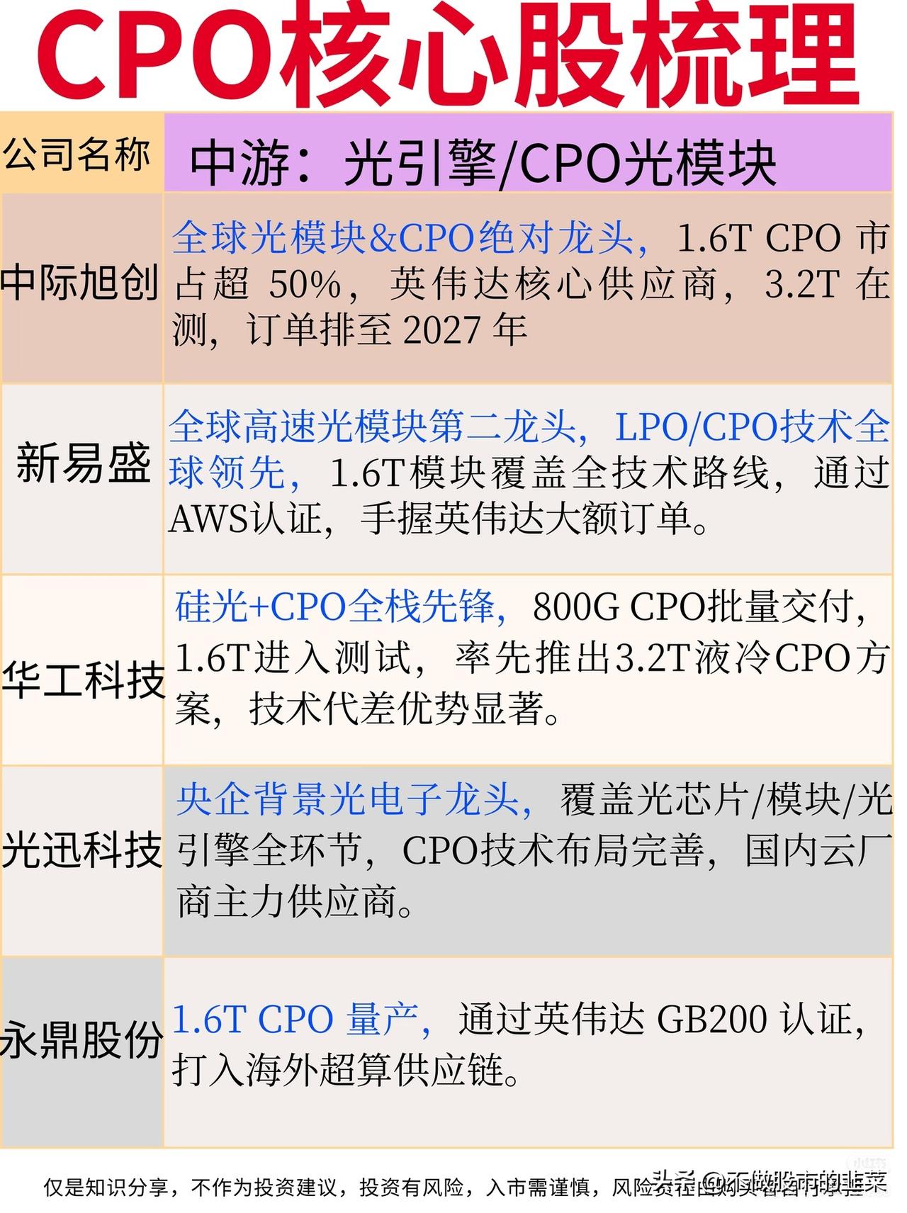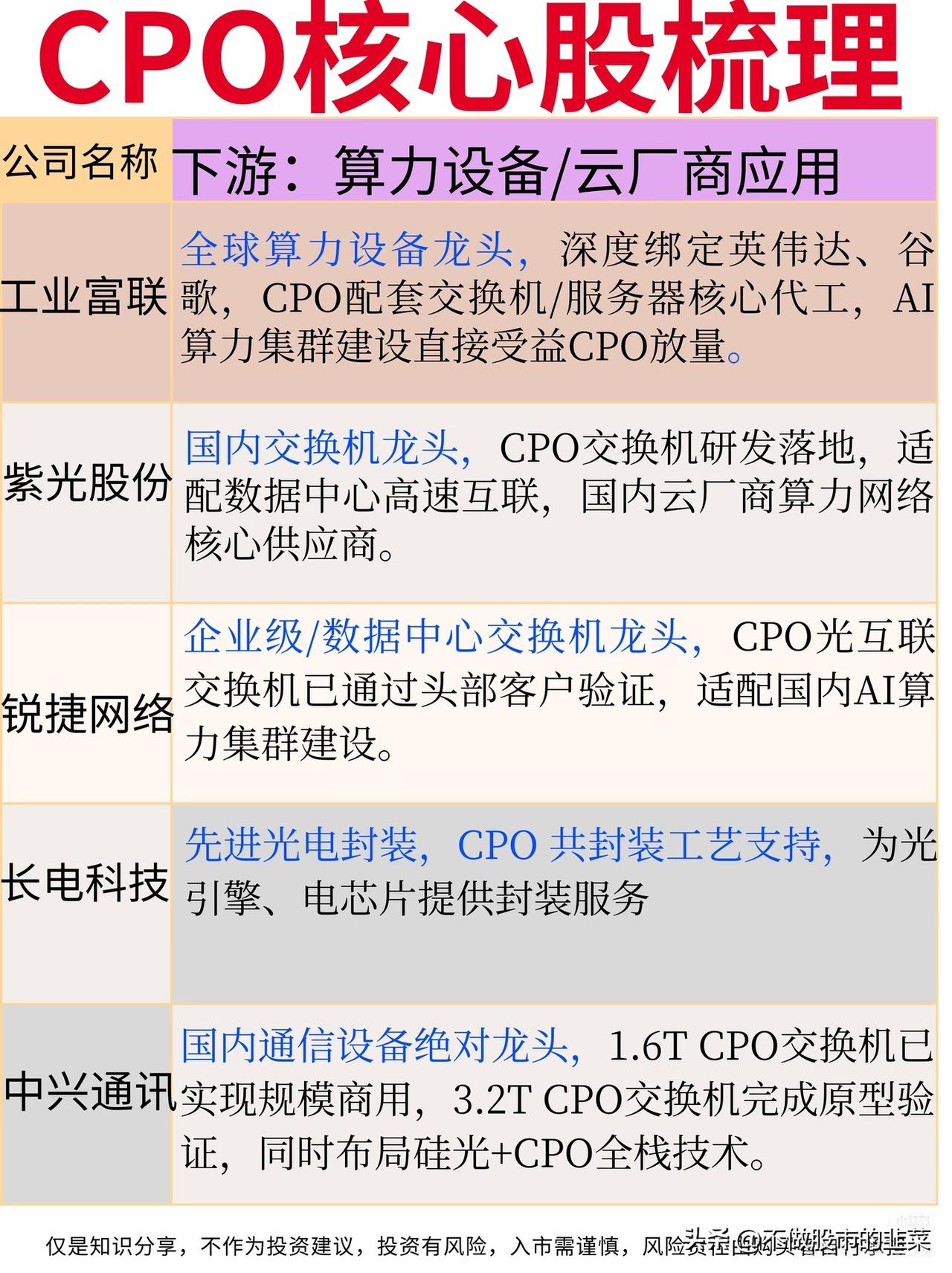 CPO赛道:AI算力互联的“高速公路”革命 当AI大模型的算力需求呈指数级爆发,传统电互联已成为性能瓶颈,CPO(共封装光学)技术正成为打通算力集群“最后一公里”的关键。近期,国内数据中心高速互联技术政策密集出台,叠加英伟达等巨头加速CPO商用落地,这条赛道迎来了技术与需求的双重共振。 🔍 赛道核心逻辑拆解 CPO的本质,是将光引擎与交换机芯片直接封装,通过缩短电信号传输距离,实现带宽提升与功耗下降,解决800G/1.6T时代的互联瓶颈。相比传统光模块,CPO可降低功耗30%以上,是支撑AI算力集群高效运行的“高速公路”,市场空间随AI算力需求扩张持续爆发。 🏭 产业链核心环节梳理 1. 上游核心光芯片:技术攻坚的“卡脖子”环节 天孚通信、仕佳光子是CPO光引擎与波分芯片的核心供应商,三环集团、胜宏科技提供陶瓷基板与高速PCB,光库科技、源杰科技在调制器与激光器芯片领域实现突破,核心壁垒在于微耦合工艺与良率控制,成长空间随CPO渗透率提升持续打开。 2. 中游光引擎/CPO光模块:赛道竞争的主战场 中际旭创、新易盛是全球CPO光模块龙头,1.6T产品市占率领先,华工科技、光迅科技在液冷CPO方案上形成差异化优势,核心壁垒在于技术路线迭代与巨头客户认证,订单排期已延伸至2027年,成长空间确定性极强。 3. 下游算力设备/云厂商应用:需求落地的关键场景 工业富联、中兴通讯为CPO交换机与服务器提供代工支持,紫光股份、锐捷网络推出适配CPO的高速交换机,核心壁垒在于设备集成能力与客户资源,直接受益于AI算力集群的大规模建设。 ⚠️ 行业趋势与风险提示 当前CPO赛道呈现三大趋势:1.6T产品进入规模化商用,液冷CPO方案成为主流方向,硅光与CPO技术融合加速推进。但需警惕风险:技术迭代速度快,部分厂商可能面临路线错配风险;客户认证周期长,量产进度不及预期;海外巨头专利壁垒较高,国产替代进程存在不确定性。 CPO赛道的竞争,本质是光芯片、封装工艺与客户资源的综合比拼。在AI算力互联需求的驱动下,具备全链条技术优势与巨头绑定能力的企业,将在这场算力互联革命中抢占先机。 股市有风险,投资需谨慎。