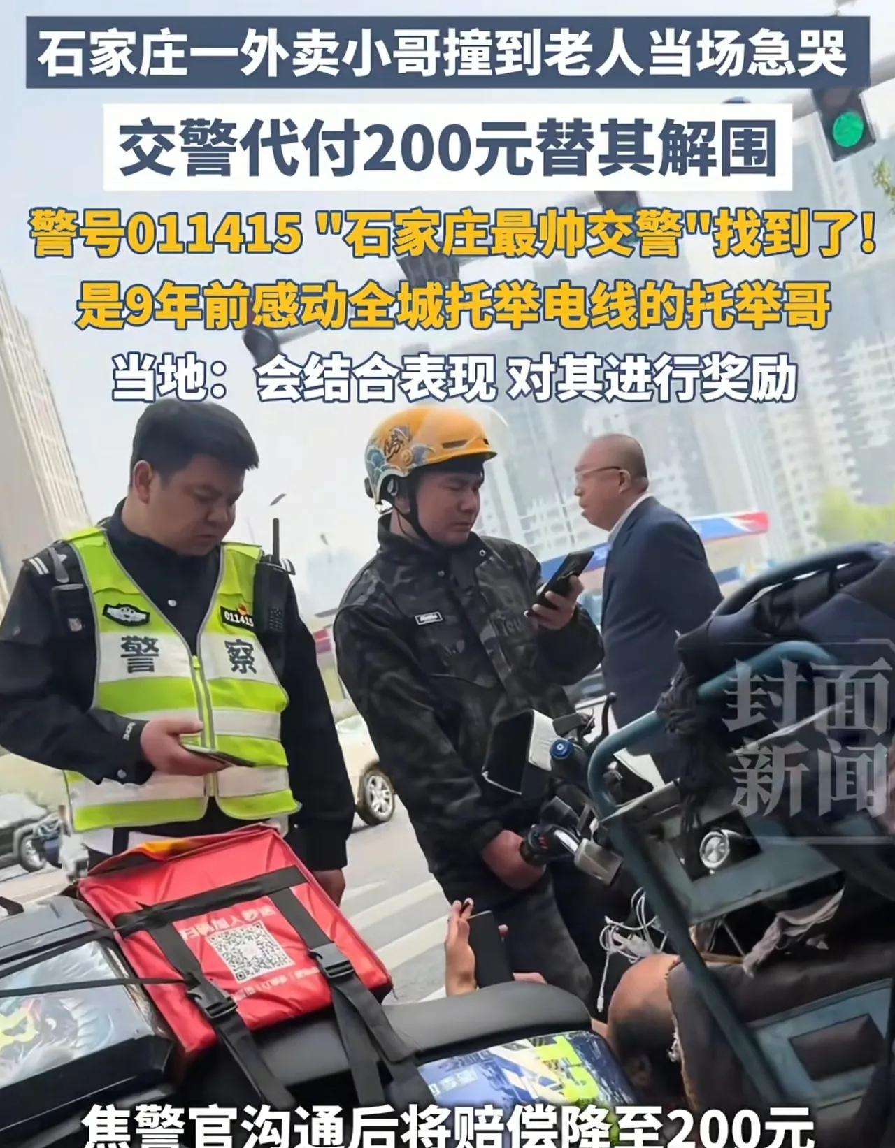 向外卖小哥索赔600块钱的那个老人,现在怎么样了? 4月15日石家庄街头,外卖小哥不慎撞倒老人,交警现场判定小哥全责,老人提出600元赔偿要求。 外卖小哥表示,所有钱都用于给女友看病,身上没有分文,无法支付赔偿,情绪十分焦急。执勤交警焦亚楠见状,积极与老人沟通调解,最终双方商定赔偿200元,这笔钱也由焦亚楠代为支付。 老人拿到赔偿款后,便起身离开现场。此事经传播引发网友关注,大家对外卖小哥的处境表示心疼,也为交警的暖心举动点赞。 据老人同村村民反映,事件引发关注后,有不少村民提及此事,老人也因此受到了一些议论,生活受到了一定影响。 从正常处理纠纷来看,老人被撞后索要赔偿,是合理的诉求,本身并无过错。但外卖小哥从事外卖行业,日夜奔波,收入微薄,又遭遇女友生病的困境,本就生活艰难,挣的每一分都是辛苦钱。 同为生活奔波的普通人,都有各自的难处,在坚守规则的同时,也该多一份理解与包容。面对他人的窘迫处境,适当的体谅,远比分毫不让更有温度。 交警的主动相助,是基层工作人员的善意担当,也让这场纠纷多了一丝温情。生活中难免遇到此类小意外,比起一味追究赔偿,换位思考、互相体谅,才能让事情得到更平和的解决。 这件事也提醒着每个人,身处底层,更要懂得彼此帮扶,少一点计较,多一点善意,才能让生活多些温暖。不必过度指责老人,也希望大家都能对辛苦谋生的人多一份宽容,毕竟,人与人之间的理解,才是最难得的温情。