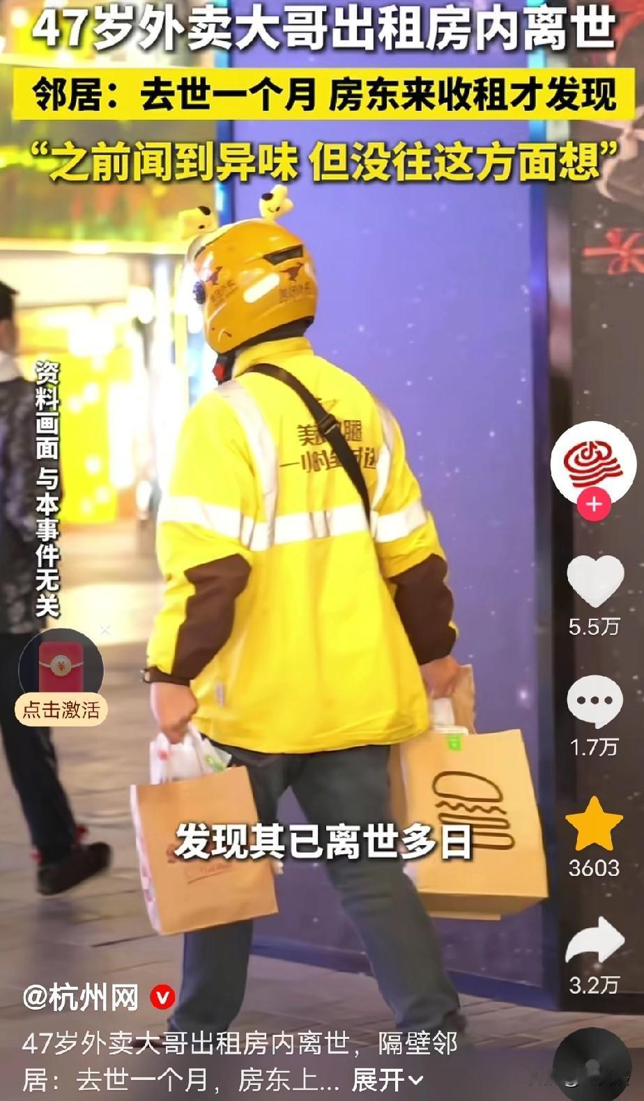 这里是首都北京!47岁外卖员在出租房里死亡一个月才被发现,网友留言看哭多少人。 4月14日,北京一位房东联系不上租房男子,上门催收房租才发现男子已死亡多日,疑似心梗猝死。 据住在死者隔壁的马先生说,租房男子是跑外卖的,今年47岁,平时就见他一个人居住生活,进进出出的两人还打招呼。近段时间马先生奇怪隔壁咋没啥动静,还以为外卖员辞职回老家了,有几天他路过门口闻到有一股异味,也没多想。目前,辖区警方已联系上男子家属前来处理。 消息爆出,很多网友不淡定了。有的说,这是哪个外卖平台的?员工连续一个月不接单,手机关机,就没人过问咋回事?有的说,男子的家人心真大,他在外打工20多天没一点消息也不找他?有的说,或许以后我也是这样,我的户口簿上只剩下我自己了,现在都不知道活着的意义是什么。 一位广东网友留言说:我也是一个人租房住,但我不害怕死亡,我害怕的是死了没人知道。这个留言下面,是长长的一串回复:我也是! 信息来源:杭州网