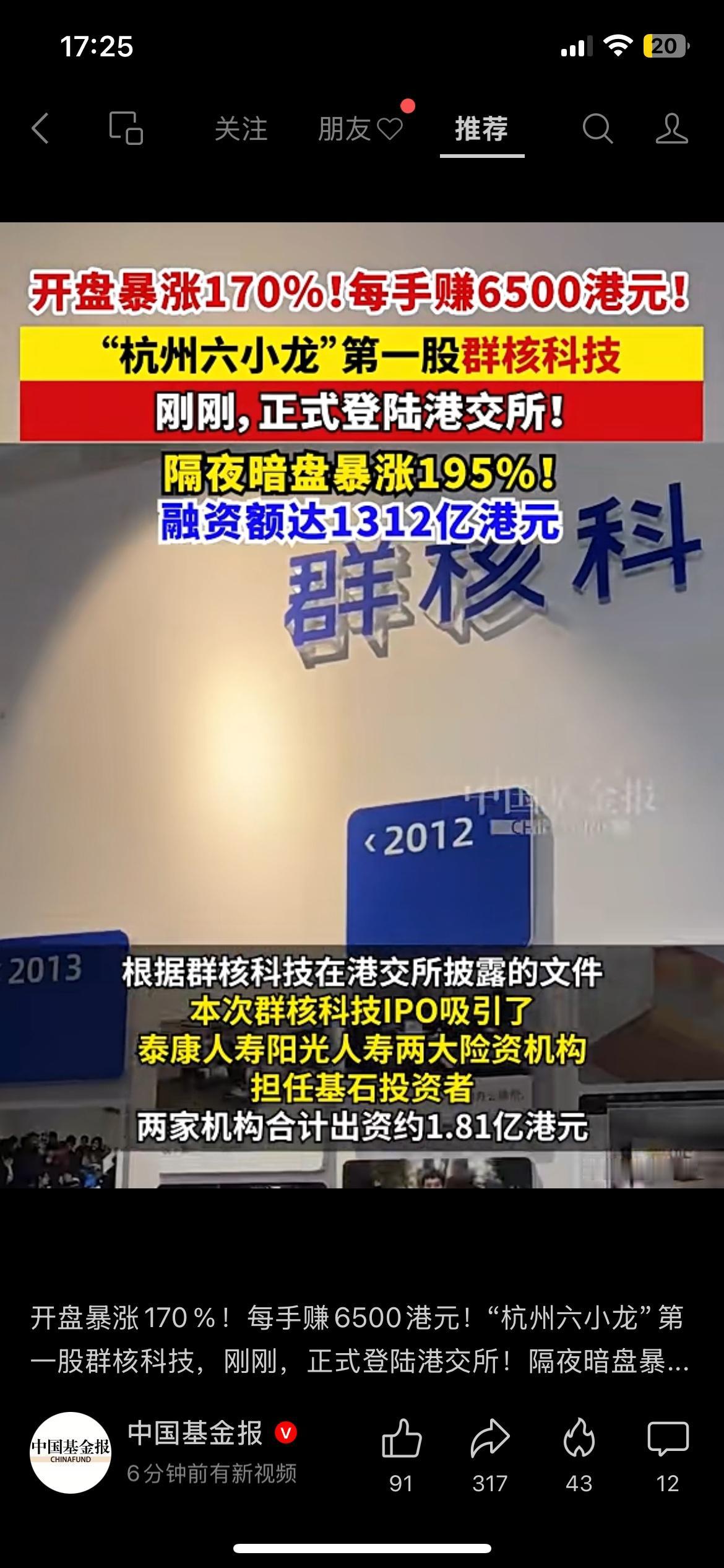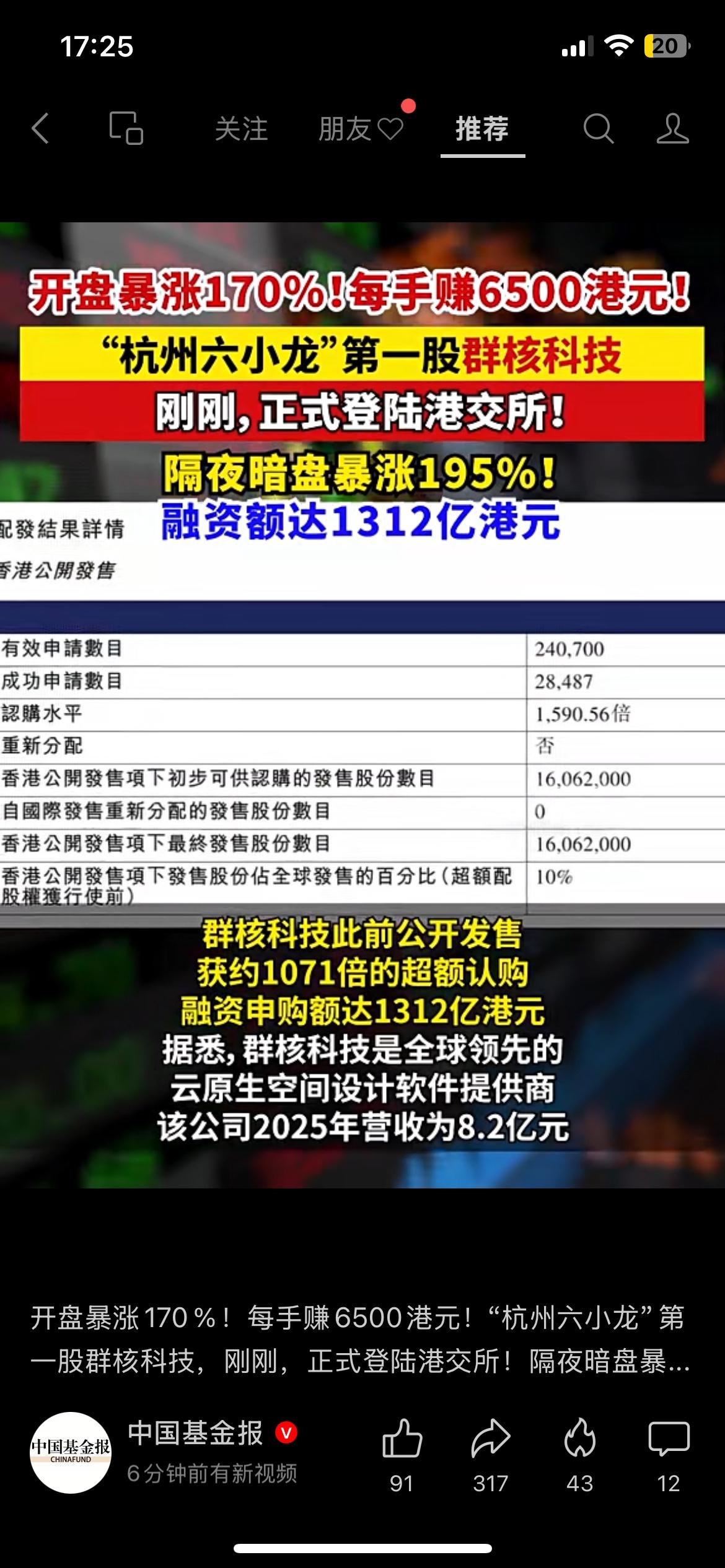 开盘暴涨170%!杭州六小龙第一股群核科技登陆港交所 群核科技正式在港交所上市,开盘大涨170%,暗盘涨幅更是接近195%,一手能赚六千多港币。这只新股此前公开申购超购1071倍,申购总额超1300亿港元,算得上今年港股热度很高的新股。公司主营云设计软件,去年营收也保持增长。 港股新股 群核科技 杭州六小龙