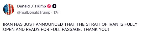 特朗普似乎欢迎伊朗在停火剩余时间内开放霍尔木兹海峡的举措。美国总统在其Truth Social平台上发帖表示:“伊朗刚刚宣布伊朗海峡已完全开放,为全面通行做好了准备。谢谢你们!”