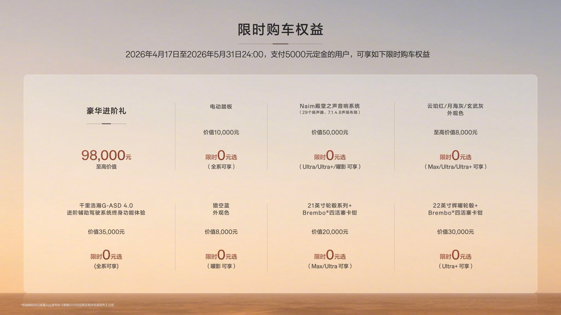 极氪8X上市限时售价32.98万元起刚刚,备受关注的明星产品极氪8X正式上市,5月31日前锁单可享限时权益后限时售价32.98万起,该车瞄准大五座市场,当前国内车市呈现六座、七座车型扎堆推出的趋势,年内相关新车规划已达29款。而随着国内家庭结构日趋小型化,冗余的第三排座椅不仅加重通勤负担,还挤占了日常核心乘坐空间。4月17日上市的极氪8X,瞄准35-55万级市场空白,以大五座布局给出了更贴合实际需求的出行方案。在极氪产品矩阵中,8X衔接9X与7X,占据核心腰部位置。该车精准解决中产用户的选车痛点,兼顾驾驶乐趣与家庭舒适,拒绝沦为乏味的家用车型。依托千匹级动力、AI底盘及900V架构,车辆在科技体验与性能表现上兼具优势,同时在空间与智能化层面实现均衡表现,满足一步到位的购车需求。极氪8X的目标用户兼顾家庭责任与驾驶热爱,偏爱长途自驾出行。车型提供豪华版与曜影版两种选择,豪华版配置均衡适配主流用户,曜影版则以1400匹马力与2秒级加速性能,满足极致性能玩家需求,为不同用户实现责任与热爱的平衡。大v聊车