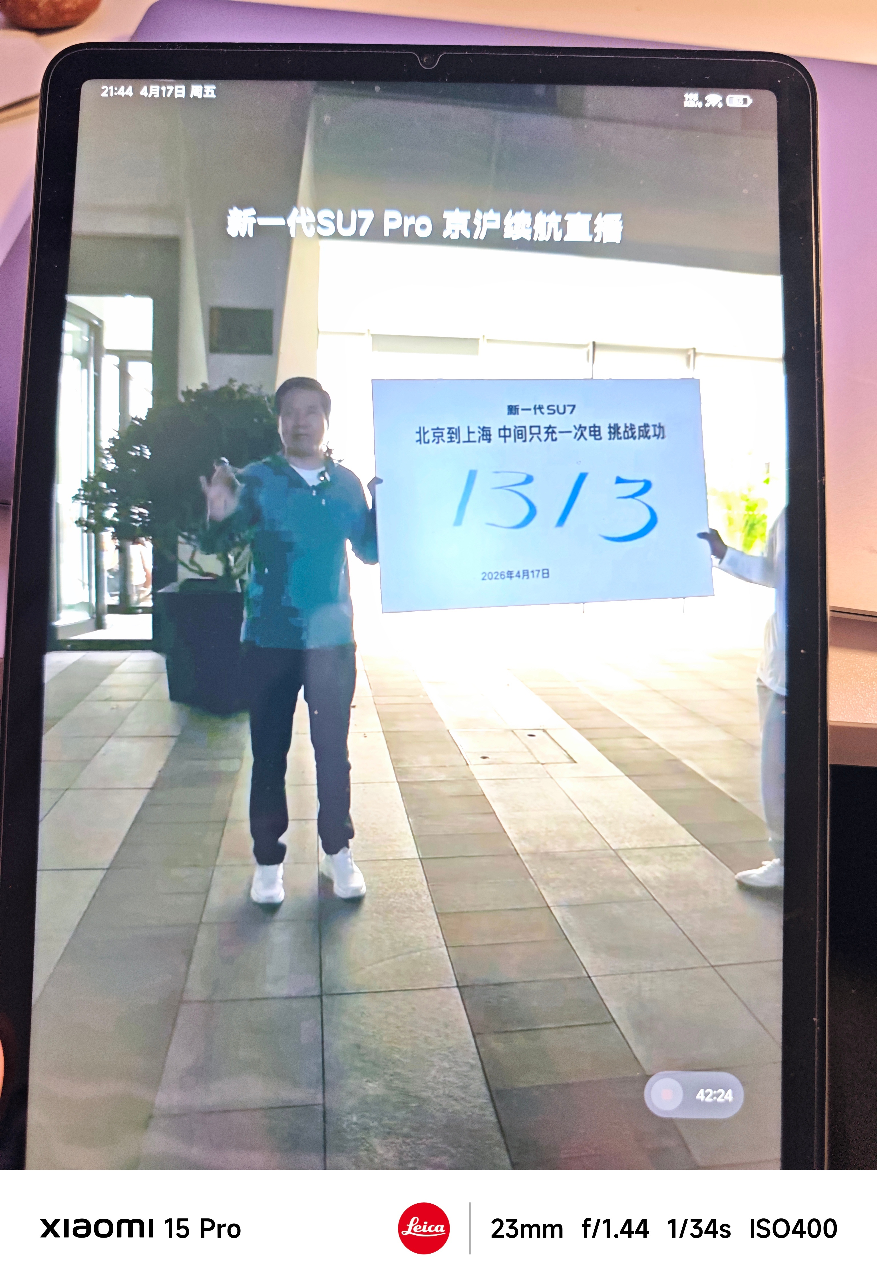 雷总这整天直播下来,基本上15个小时左右,马不停蹄从北京到上海,中间只充一次电,而且还不是电量耗完才充的,还有剩余电量就直接充了的。并且值得一提的是,全程高速基本都是满格顶着限速120来开的,车上三个人加上全套直播设备,几乎就是满载的状态,1313公里,新小米SU7 Pro果然没有让大家失望,挑战成功!这个成绩,可以用上那四个字了!