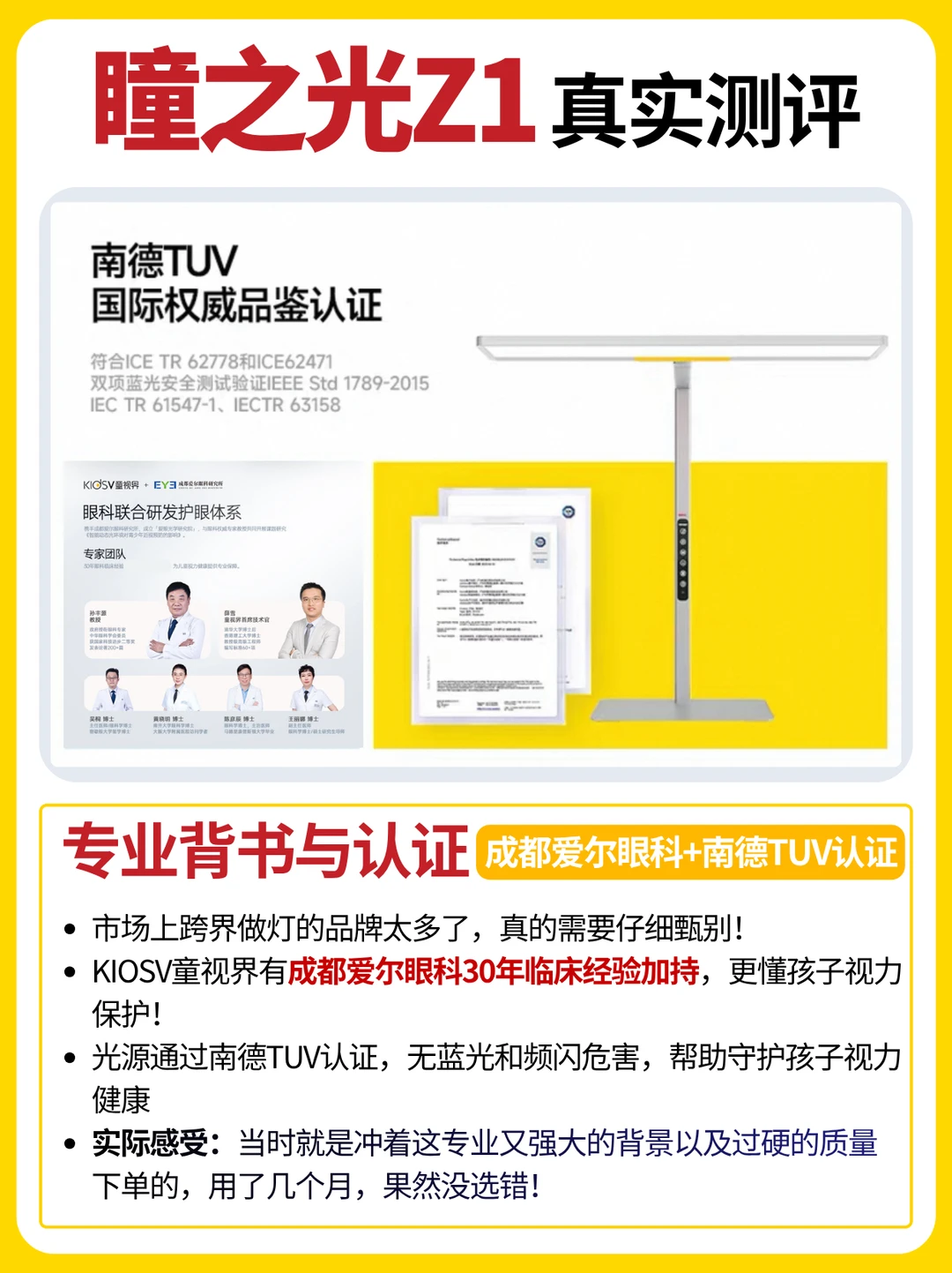 市场上跨界做灯的品牌太多了,妈妈们真的需要仔细甄别!童视界有成都爱尔眼科30年临床经验加持,安心度直接拉满!而且光源通过南德TUV权威认证,无蓝光和频闪危害,帮助守护孩子视力健康,作为妈妈我更放心了!