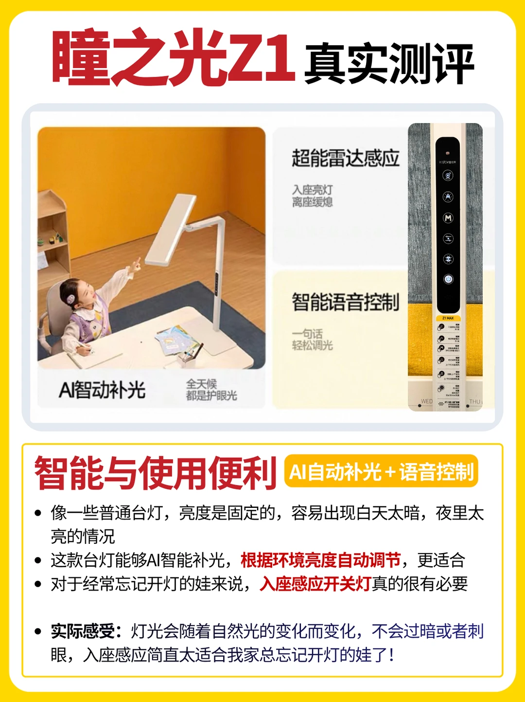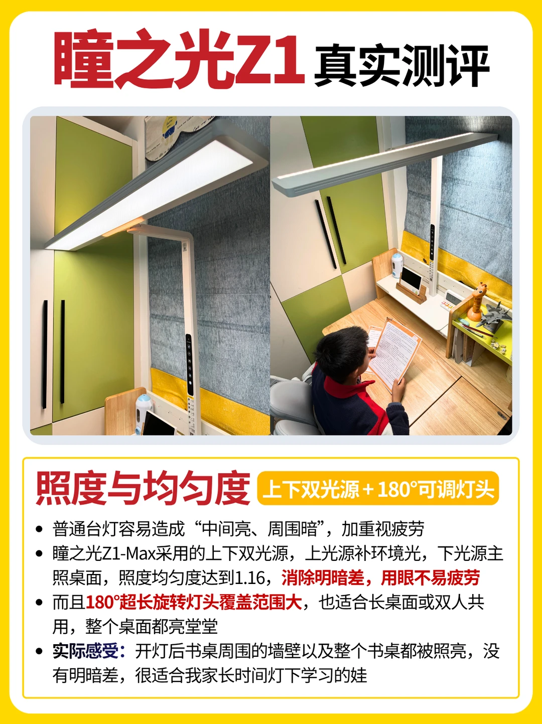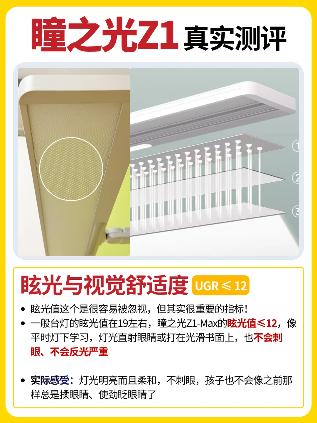 一般台灯的眩光值在19左右,瞳之光Z1-Max的眩光值≤12,灯光明亮而且柔和,就算不小心直视,也不会觉得刺眼,用眼舒服很多,孩子也不会像之前那样总是揉眼睛了